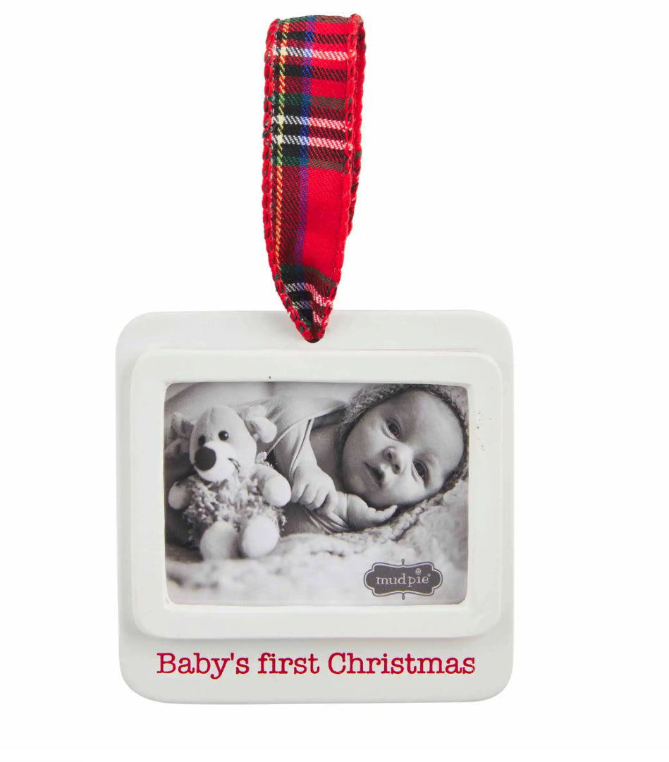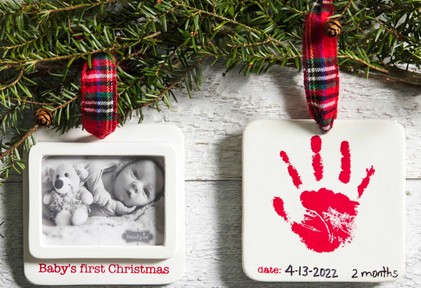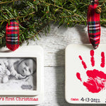 Our First Christmas Handprint Ornament Kit is a true memory maker. The two piece set comes with a ceramic photo ornament with tartan loop hanger. The front of the ornament reads "Baby's first Christmas". The ornament comes with a non-toxic ink pad for handprint personalization. Bake at 300 degrees for 30 minutes.