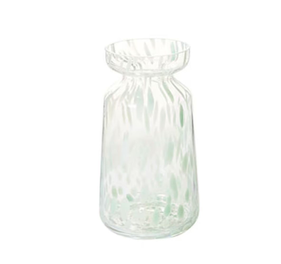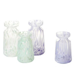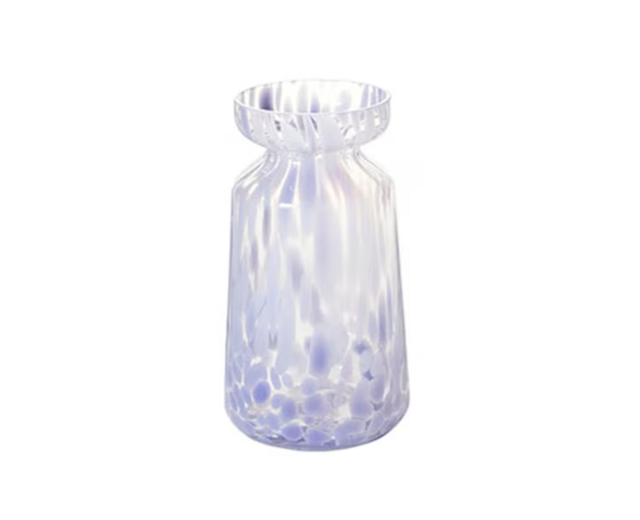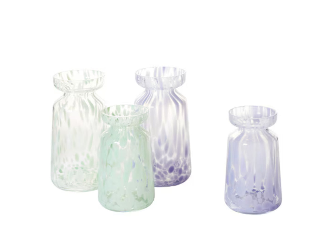 Add a modern touch to your home decor with our Cambria vase. Made with a unique glass blown look, its interesting shape and pattern will make a statement in any room. Measuring at 5.5” x 9.75”, it comes in green or purple. Elevate your space with this eye-catching piece.