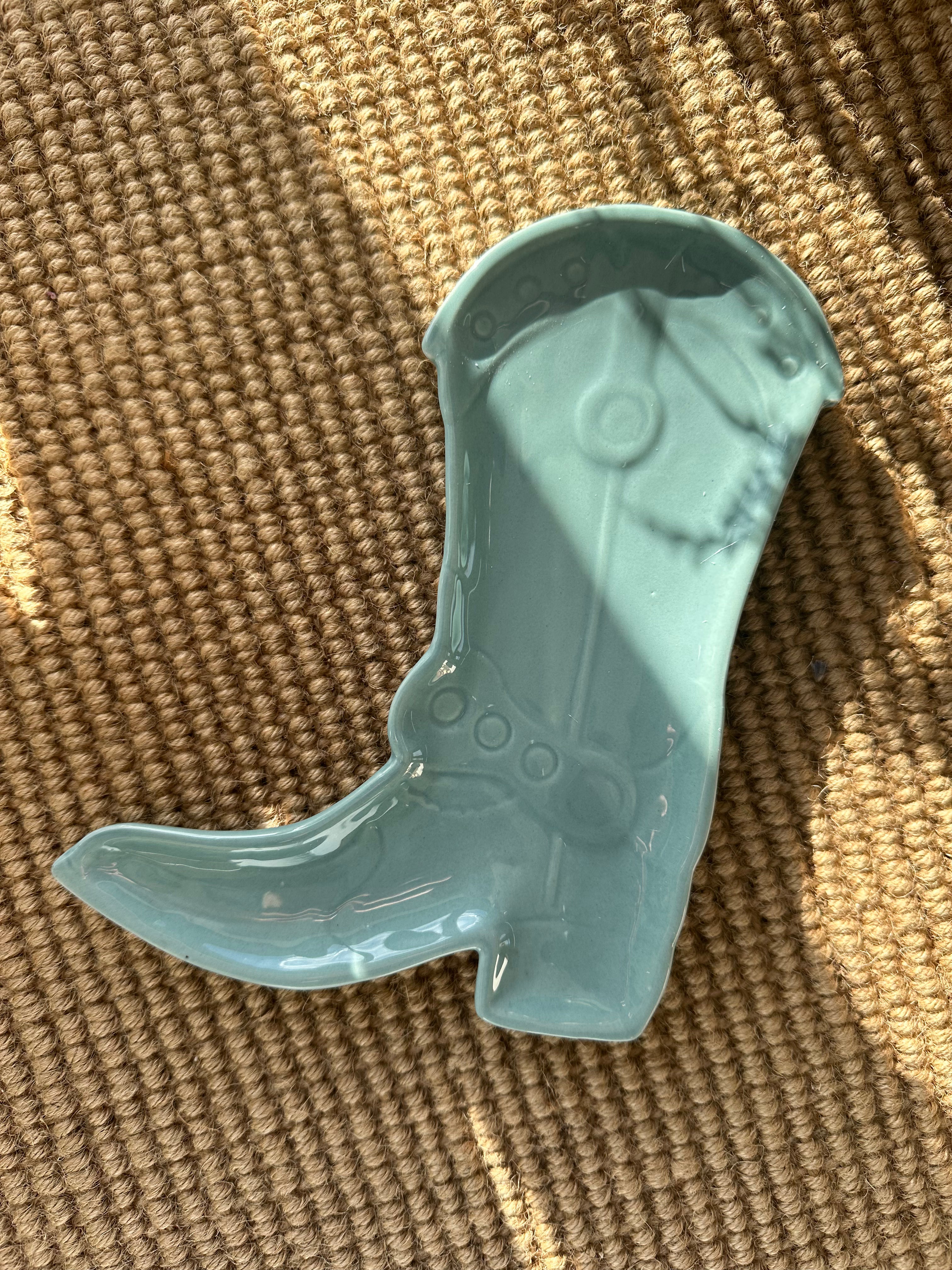 This Ceramic Trinket Dish features unique designs of a cactus and cowboy boot. Made from high-quality ceramic, it is perfect for holding your small items like jewelry and trinkets. Add a touch of charm and organization to your space with this versatile and stylish trinket dish.