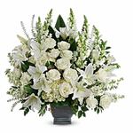 As hopeful as the bright horizon ahead, this glorious white bouquet of hydrangea, roses, lilies and snapdragons is a peaceful tribute to a truly beloved.
