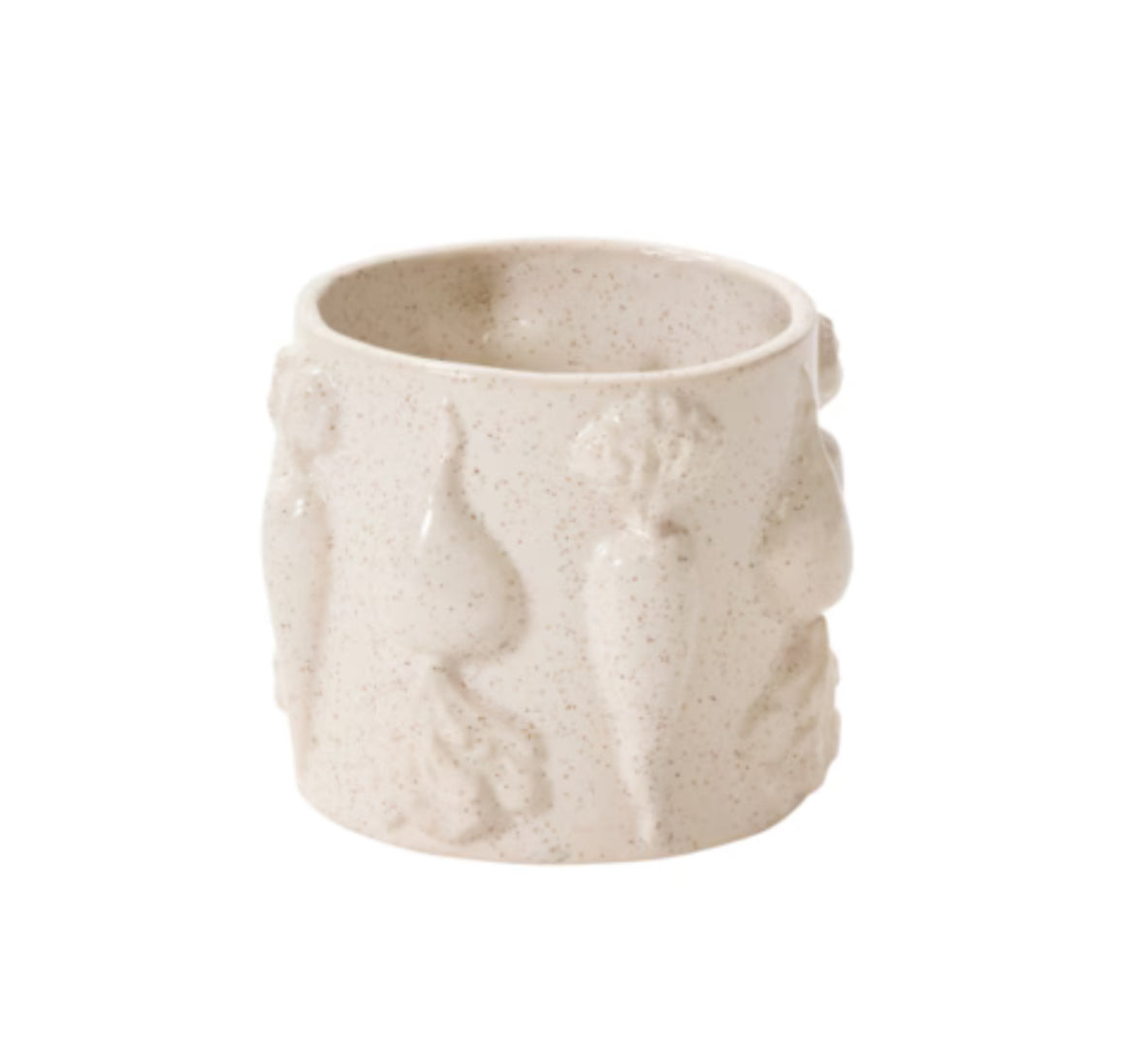 "Elevate your indoor garden with our Veggie Pot! This taupe plant pot features unique vegetable moulds on the side, adding a touch of charm to your greenery. Measuring 5" by 4", it's the perfect size for your herbs and greens. Spruce up your space with this delightful and functional pot."