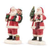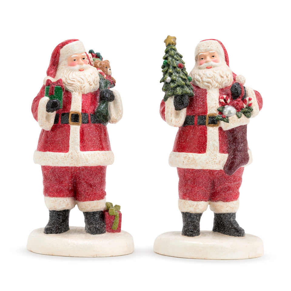 These  lovely Santa Paper Pulp Figures  are a wonderful addition to any home this holiday season. These  decorative figures feature a bold vintage-inspired aesthetic and bright festive colours. Each is designed with a unique Santa Claus character wearing his signature red hat and coat. One Santa holds a bag full of beautiful presents while the other holds a Christmas tree and filled stocking.