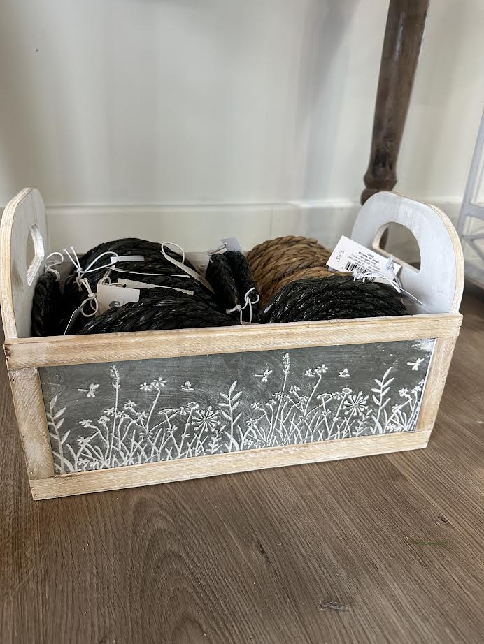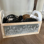 Store your items or plants in style with our Wooden + Metal Floral Box. The wooden trim and metal front with elegant white painted flowers add a touch of charm to any space. The convenient handles make it easy for carrying or displaying as a decorative piece. Functional yet beautiful, this box is perfect for any storage or plant needs.