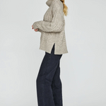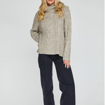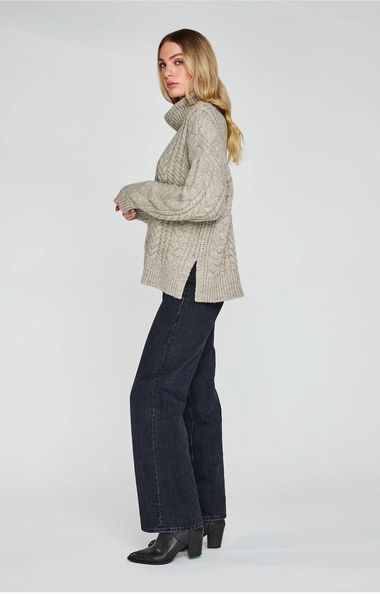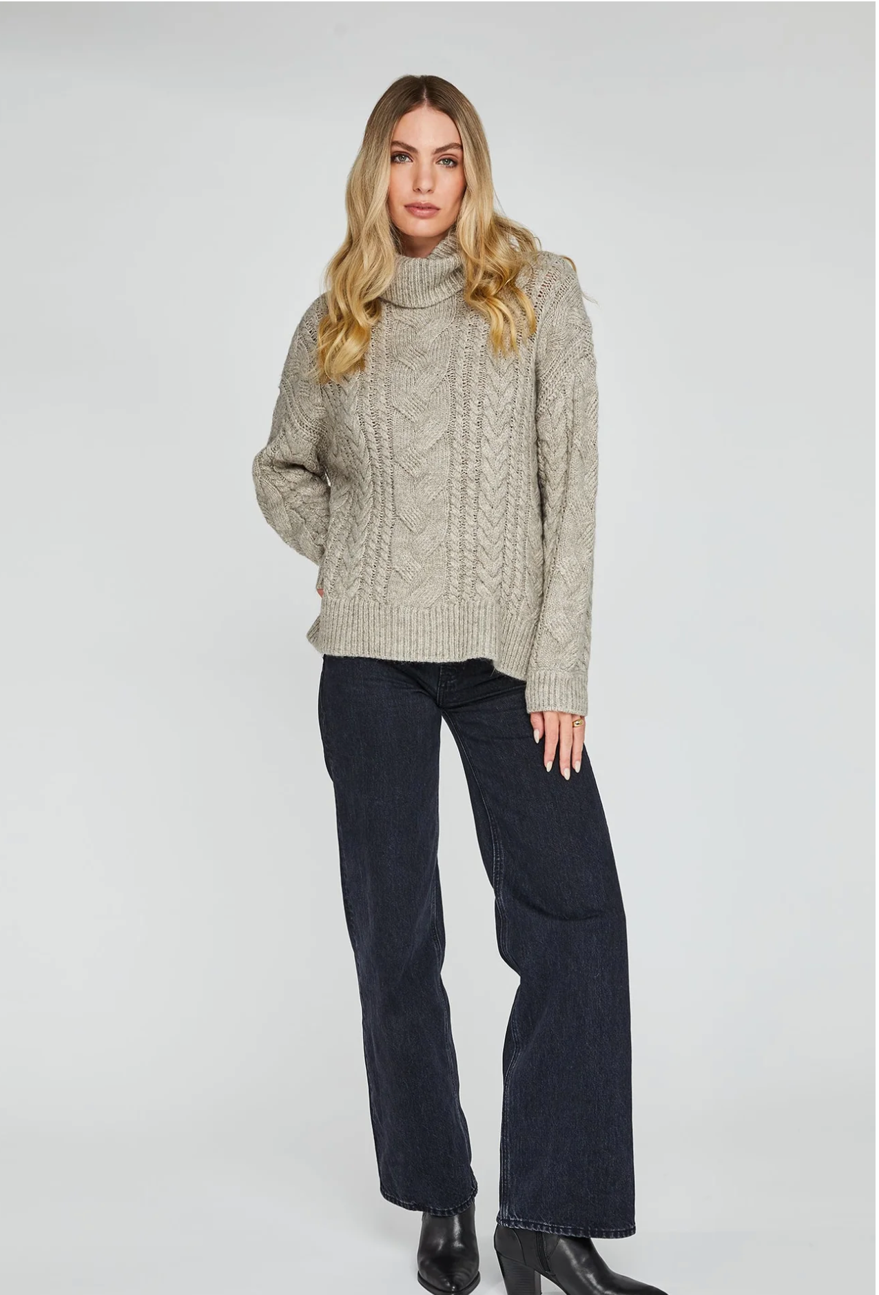 The Marnie sweater in Heather Pumice Grey is made of a cozy yarn with various cable knit patterns throughout. Features include a slouchy turtleneck and side slits for an effortless look.