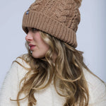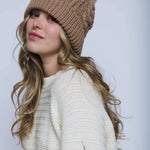 This pretty cable knit beanie is lined in the softest sherpa faux fur. Features a turn back rib knit cuff and a matching pom.