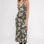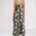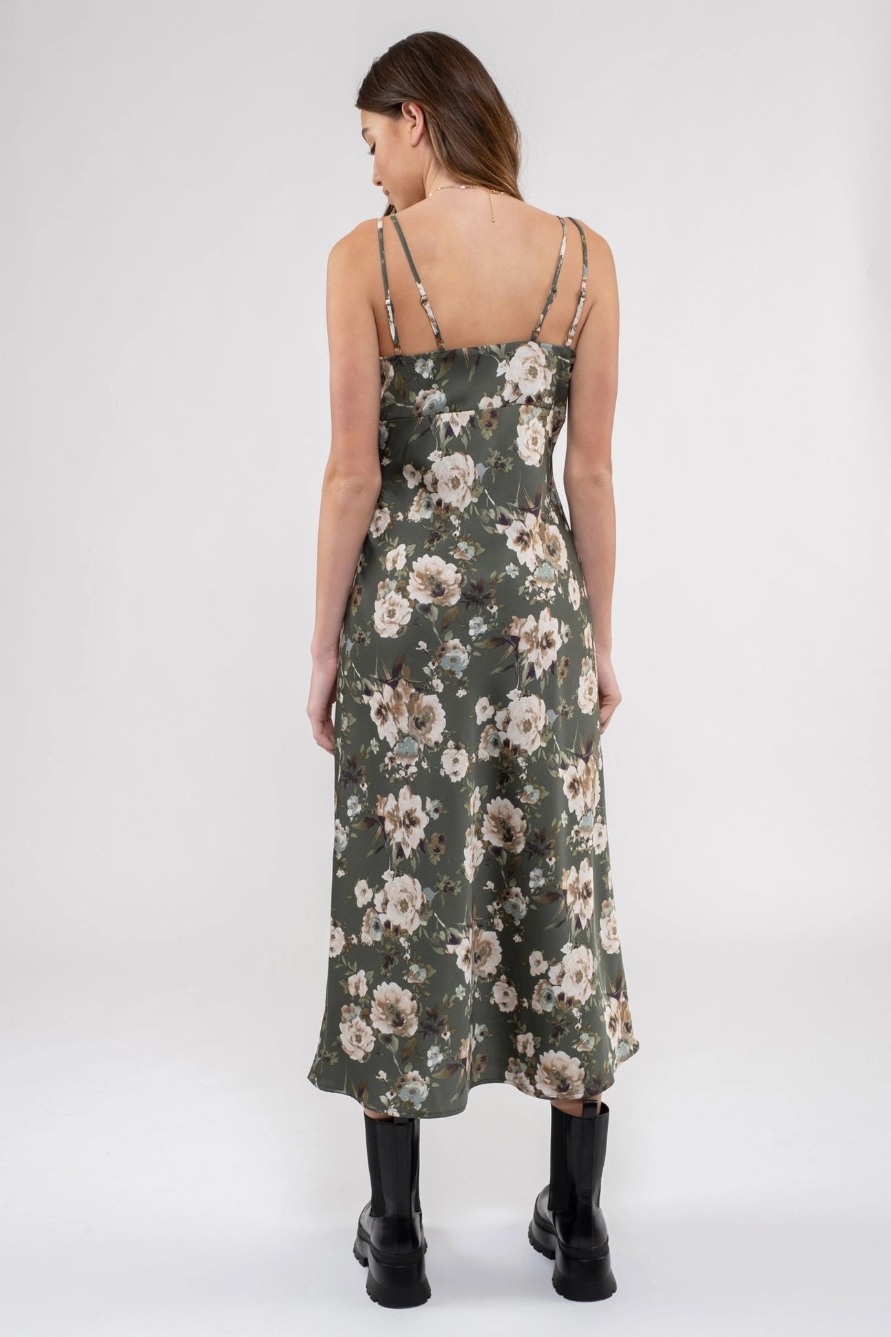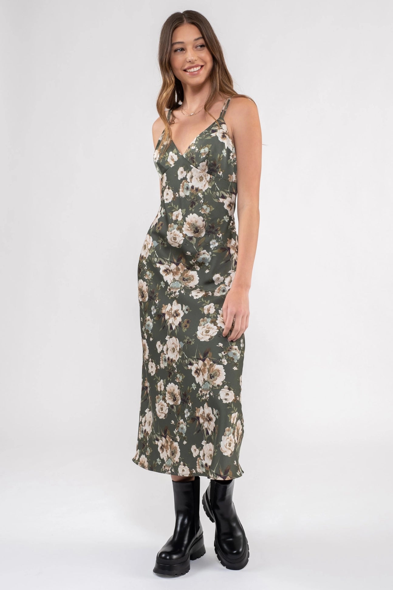 Expertly crafted from luxurious satin, our Floral Print Midi Dress features a charming green and beige floral pattern. The soft, flowing fabric drapes elegantly and provides comfort for all-day wear. Perfect for any occasion, this dress adds a touch of sophistication to your wardrobe.
