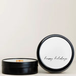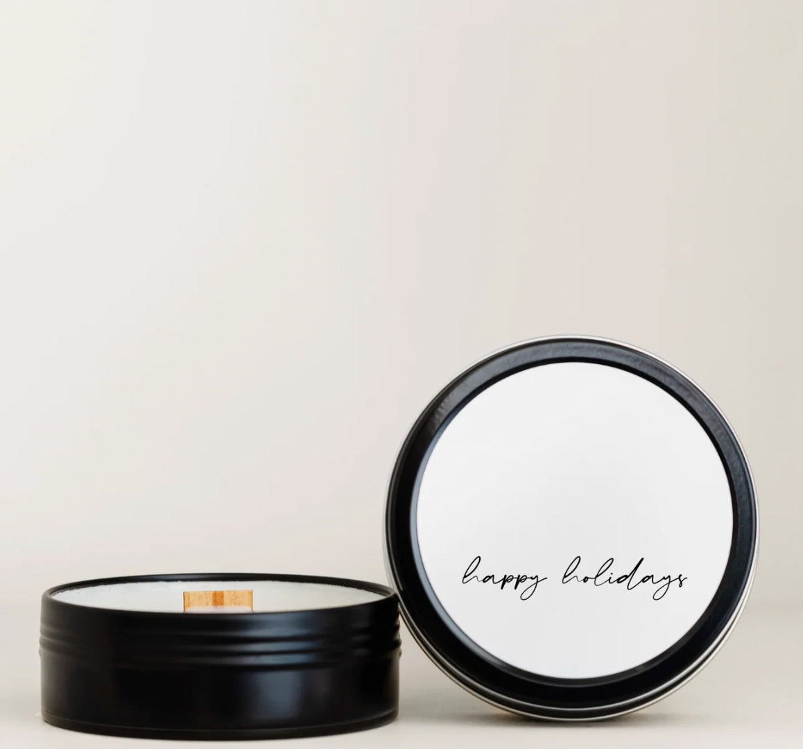 "Create a cozy holiday atmosphere with our Happy Holidays Soy Wax Candle. This warm, gingerbread scented candle features a wood wick and a festive message to spread holiday cheer. Perfect for gifting or adding a touch of holiday spirit to your home."
