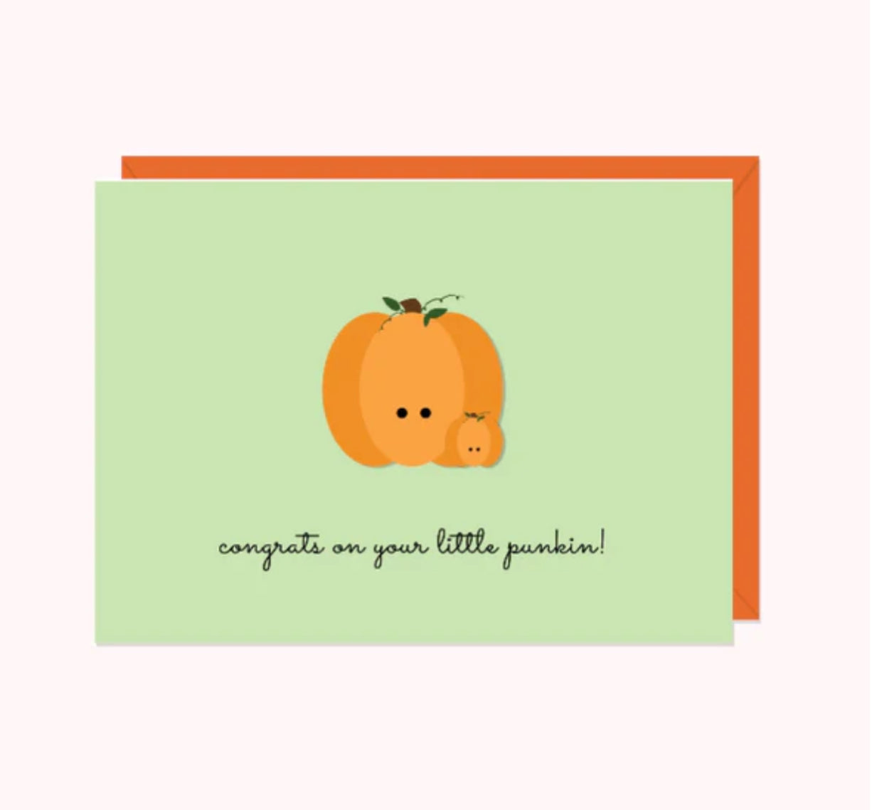 Celebrate the arrival of a chubby little pumpkin with our darling "punkins" note card!