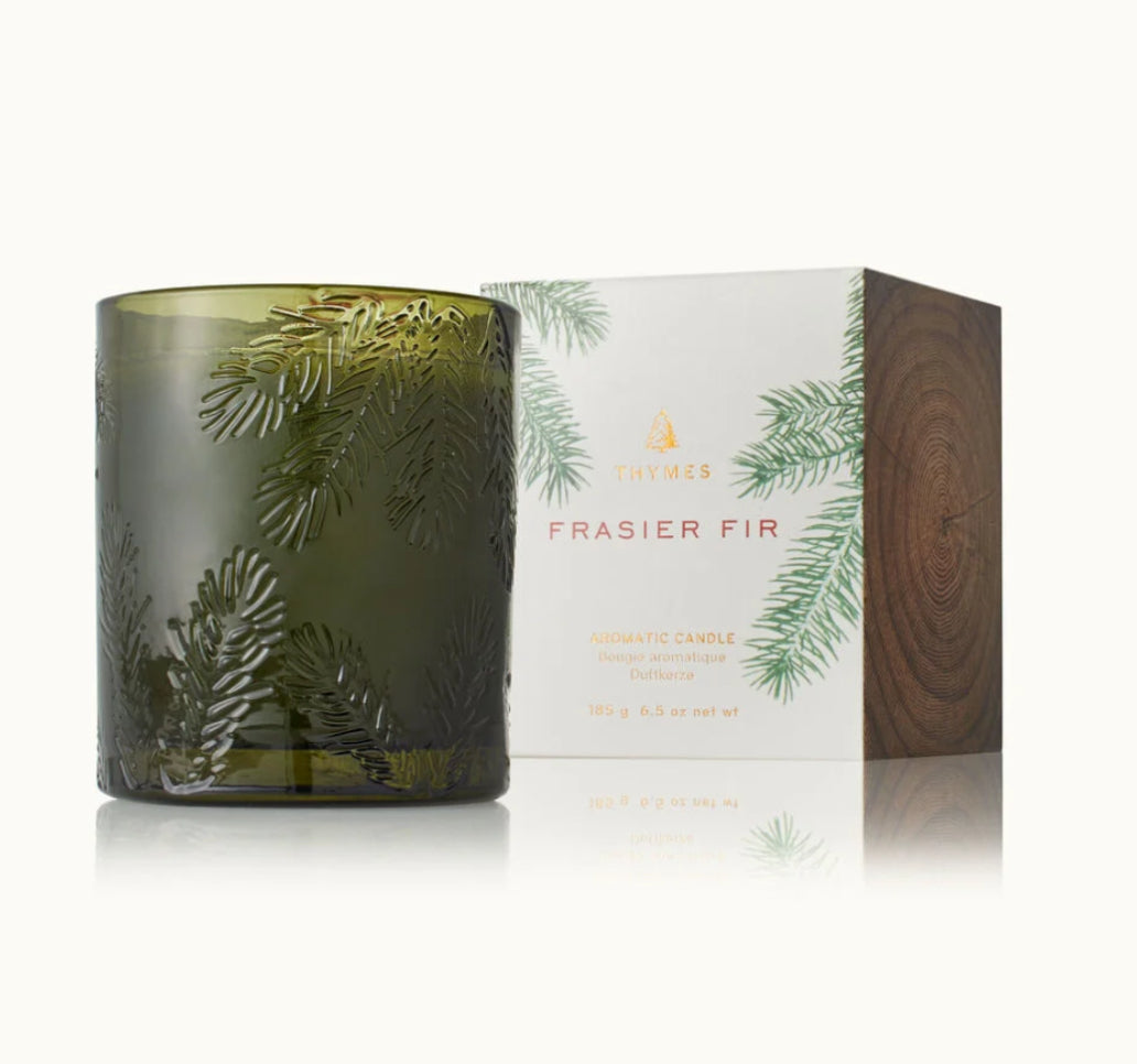 Mountain fresh and glowing, this best-selling candle sets the mood for special moments. This green glass is molded to reflect on the iconic, Frasier Fir pine needle design.