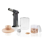 - Includes: 14 oz. lowball glass, smoker, fine mesh strainer, handheld butane torch (fuel NOT included), and a tin of oak wood chips