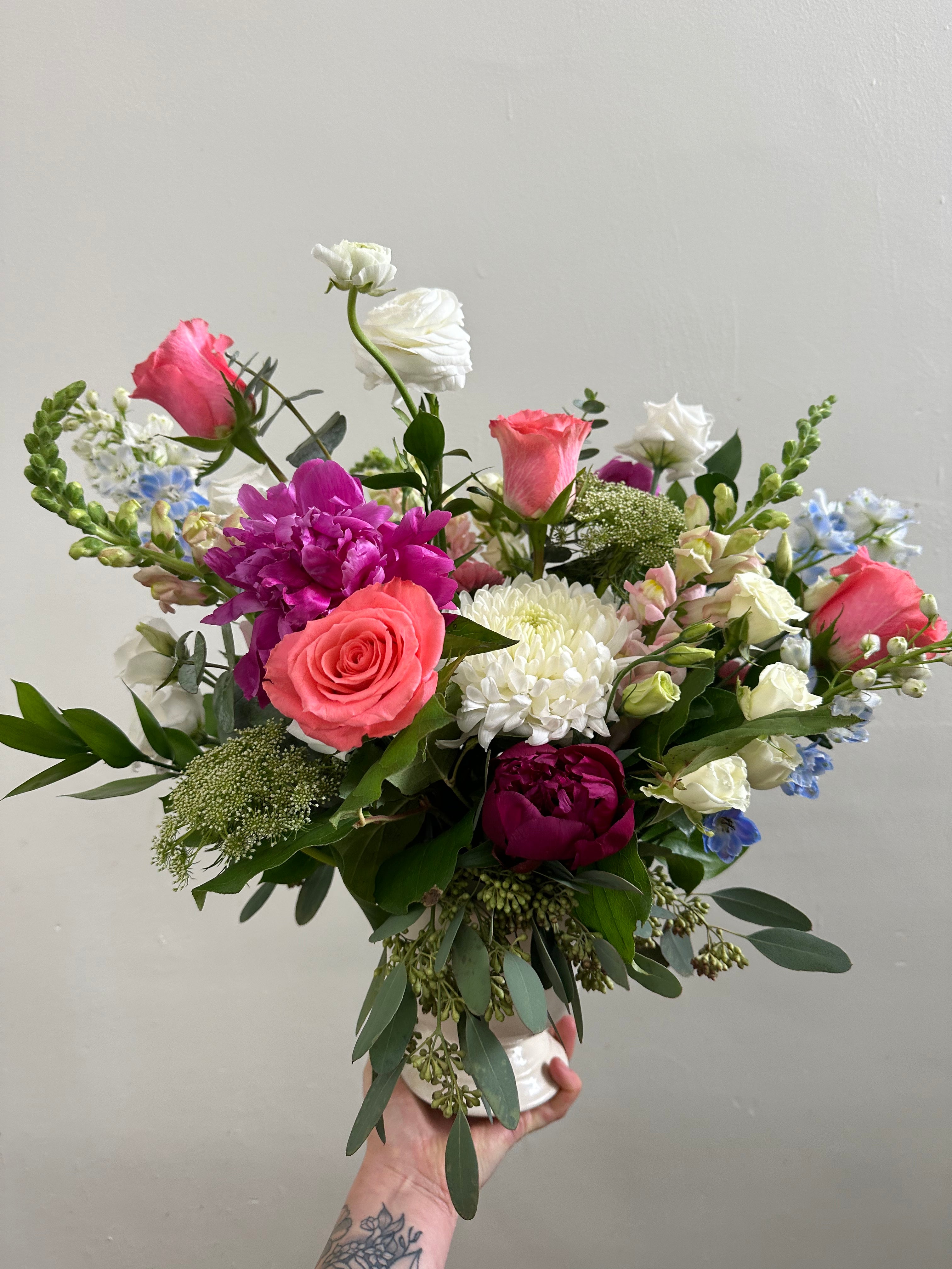 Transform your space into a tranquil oasis with our Summer Meadow Blooms Arrangement. This fresh flower arrangement is handcrafted with a delicate mix of pink, purple, and white blooms, making it the perfect centerpiece for any occasion. Brighten up any room and add a touch of natural beauty to your decor.