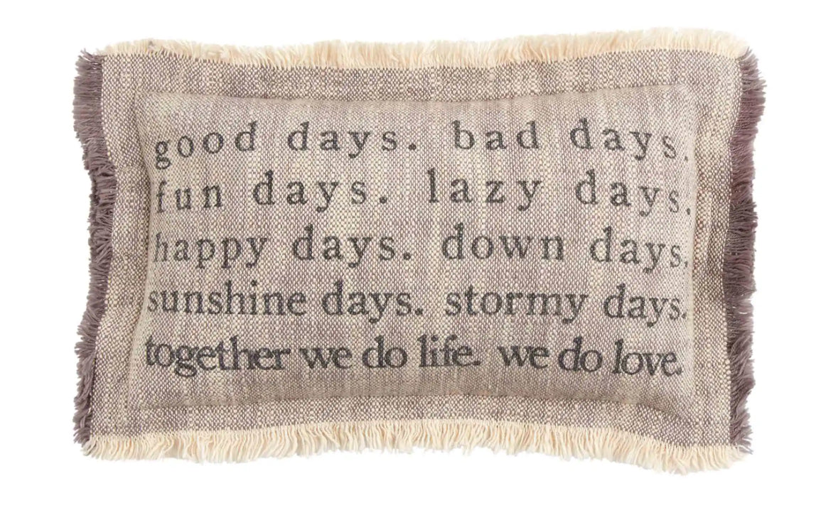 Good Small Throw Pillow is perfect for the good days, and even the bad days. The cotton lumbar pillow features a frayed flange. The pillow has a zipper closure. The pillow arrives with an insert that is vacuum-sealed and located inside the pillow cover. The entire product arrives vacuum sealed for shipping and storage ease.