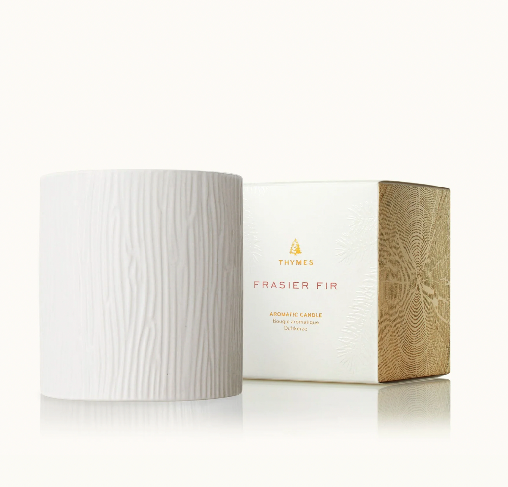 Bring the beauty and warmth of Frasier Fir to your home with this elegant wood grain ceramic candle with 24-karat gold trimmings.