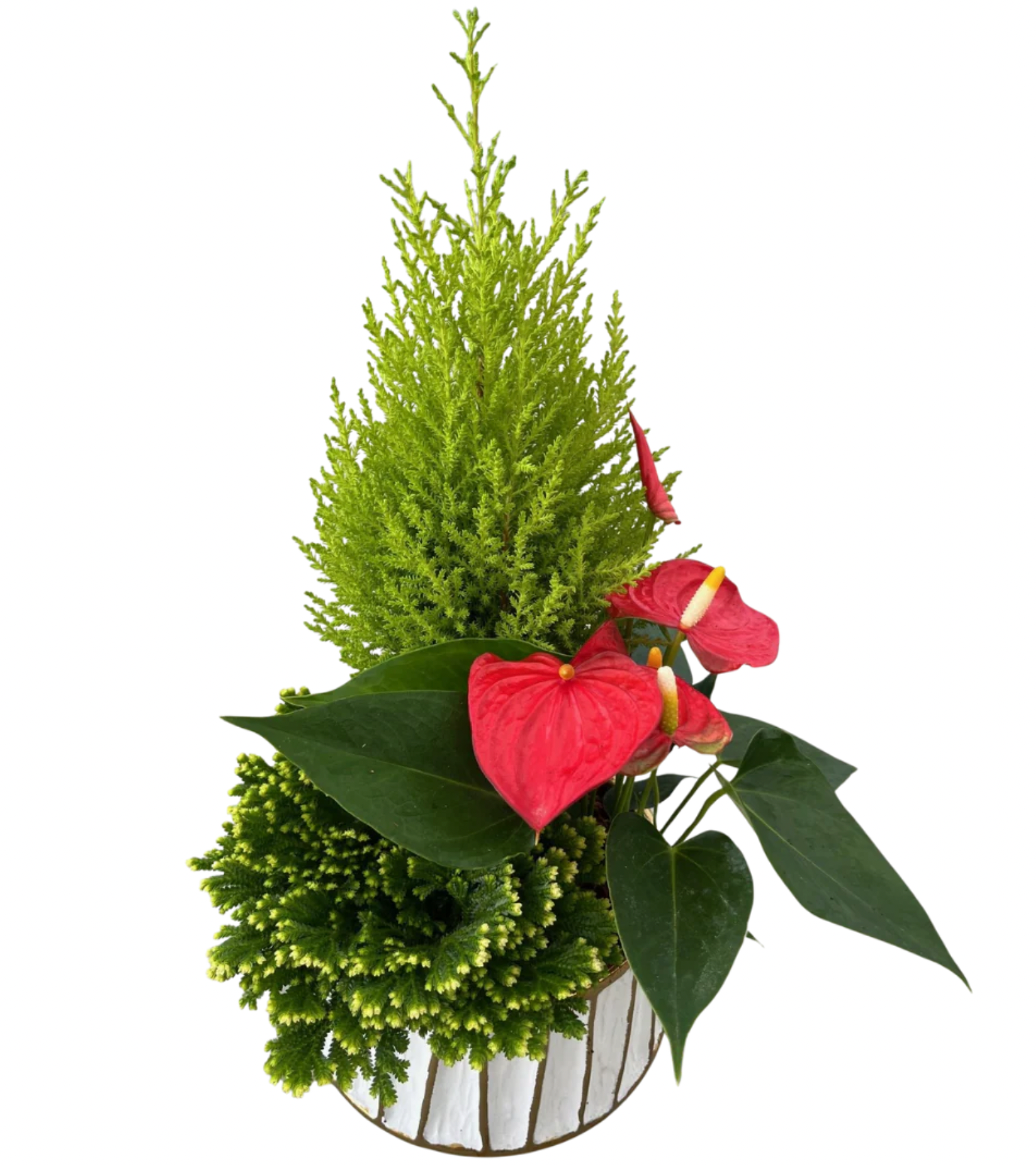 Add a festive touch to your home with our Christmas White Gold Stripe Tropical plant. With a mix of cypress, frosty fern, red anthurium, and an Xmas pick in a gold and white stripe pot, this plant will bring holiday cheer and style to any room.