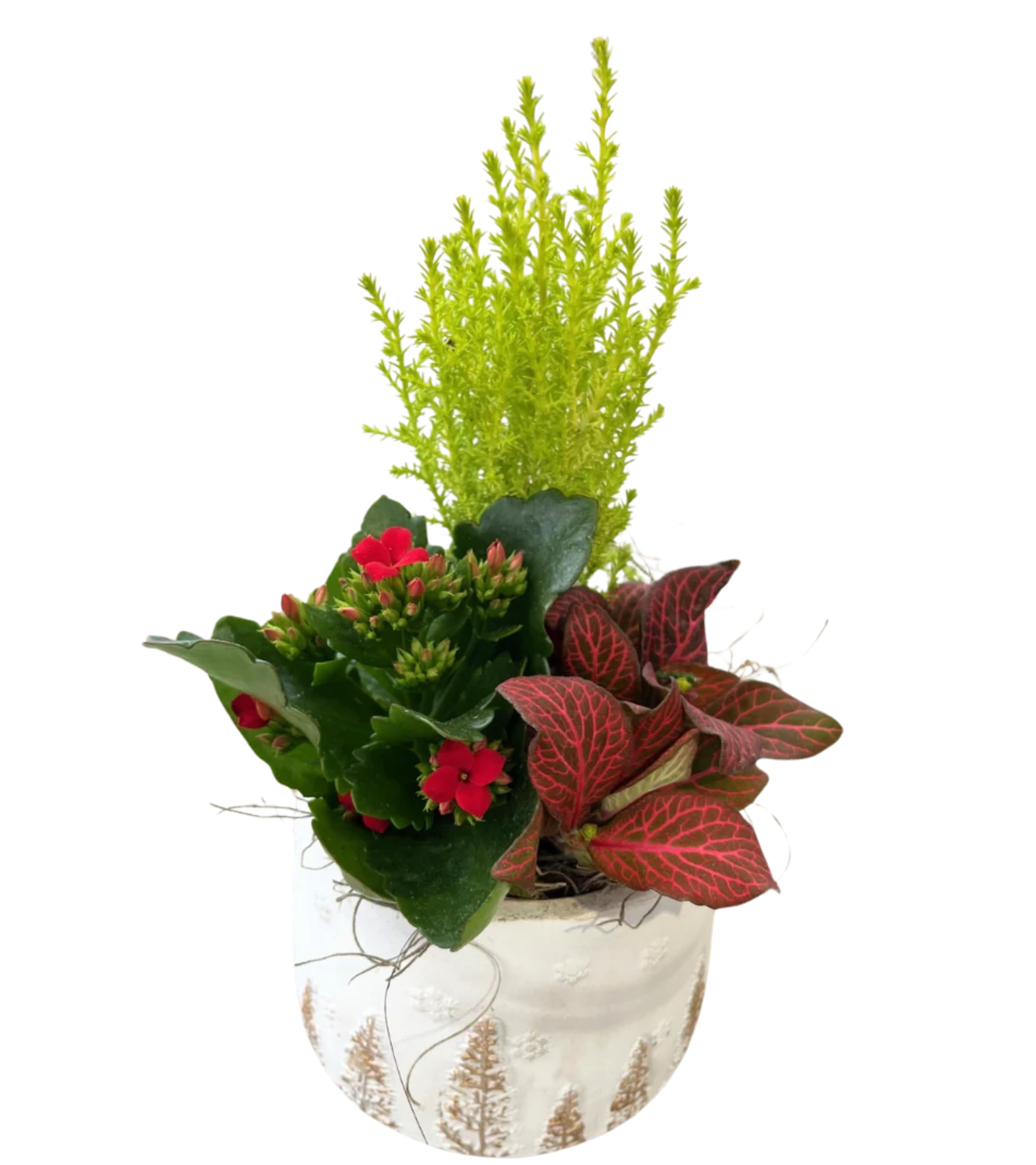Bring festive charm to any space with this elegant white ceramic planter featuring a shimmering gold tree design. This thoughtfully curated plant mix includes a lemon cypress for graceful height, delicate fittonia for soft texture, and hardy kalachoe for lasting colour. Perfect for holiday décor or year-round enjoyment, this combination thrives with moderate light and occasional watering. An ideal gift for plant lovers or a lovely way to celebrate the season.