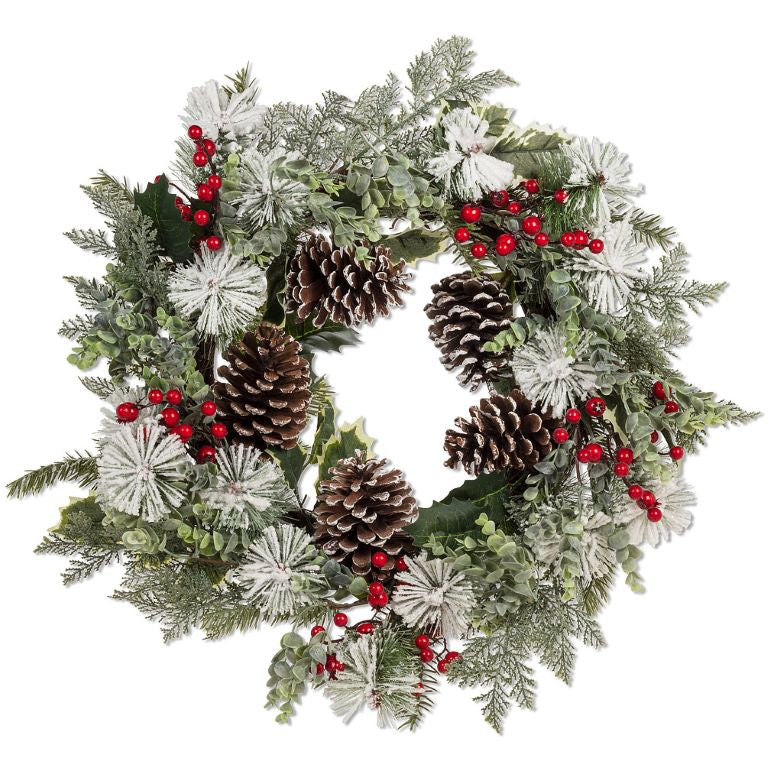 Crafted out of natural material and plastic, this wreath comprised of snowy, frosted pine sprigs and snow-dusted pinecones is accented with bright red berries that makes a wonderfully rustic welcome for all your houseguests