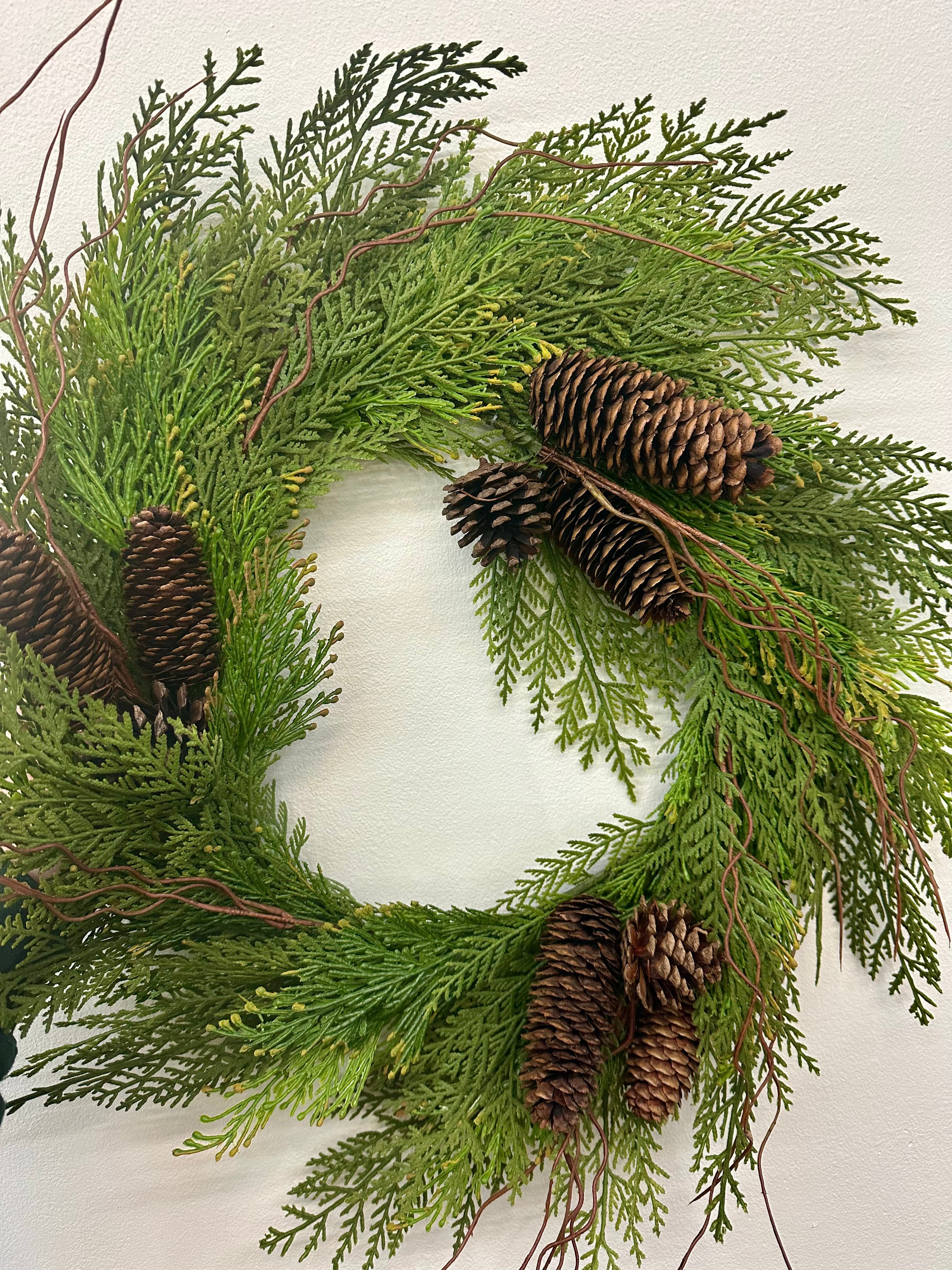 This Wreath With Pinecones is perfect for any occasion, featuring faux greens and pinecones for a natural look. Whether you hang it up for the holidays or use it to decorate your living space, it's sure to bring a beautiful touch of nature indoors.