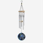 Create your own relaxing oasis in outdoor settings with the soft sound of chimes with this Blue Bird Windchime. A stunning decor piece that will create a tranquil ambiance in any space, this hanging windchime features a colorful blue bird design dangler and silver windchimes. Comes with a metal chain hanger. Pine Wood, Aluminium, Glass, Iron.
