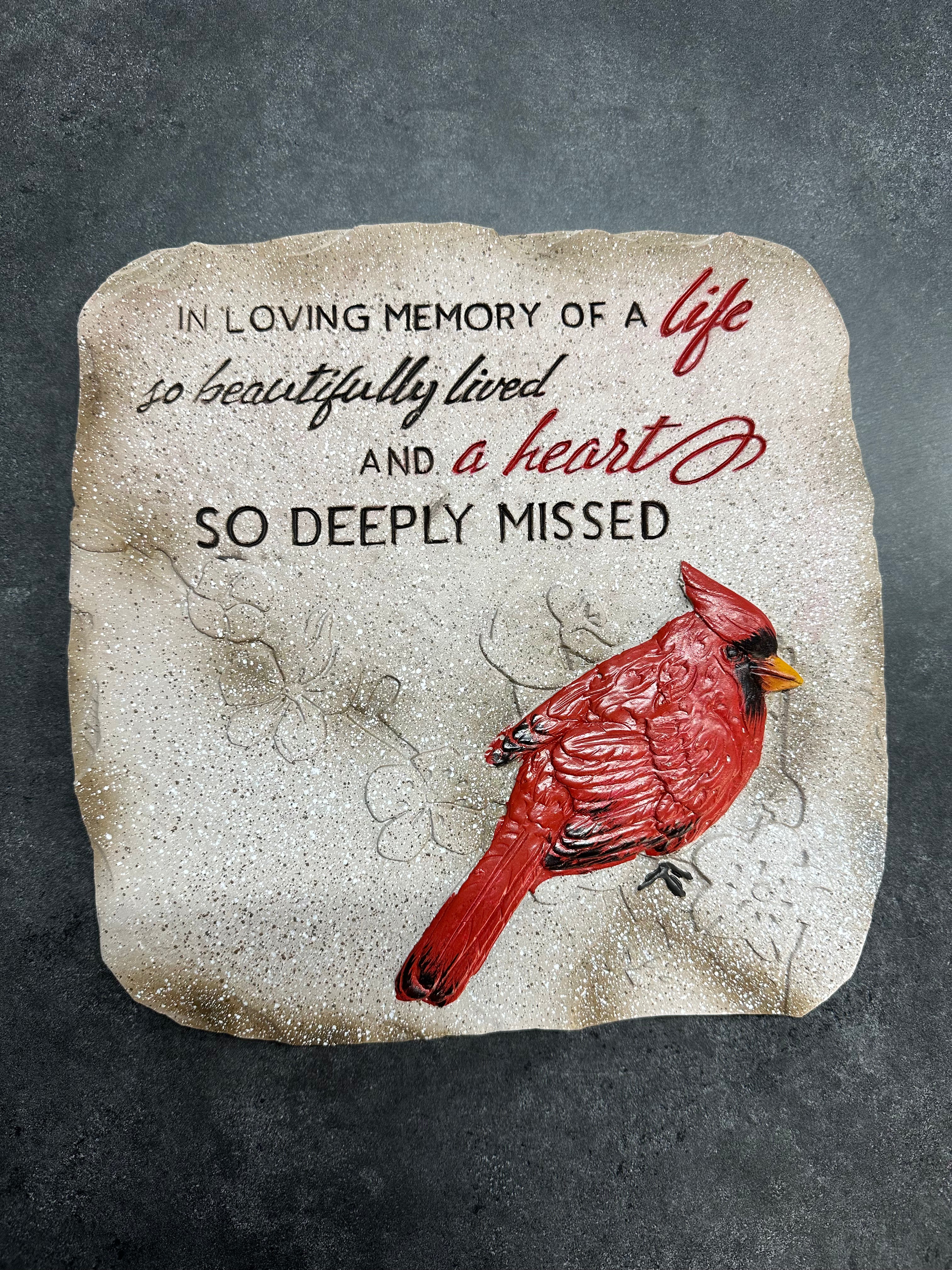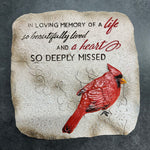 Honor the memory of your loved ones with our Cardinal Memorial Stone. This beautifully crafted stone features a cardinal and a heartfelt sentiment, serving as a peaceful reminder of their everlasting presence in your heart and home. Keep their memory alive with this meaningful tribute.