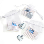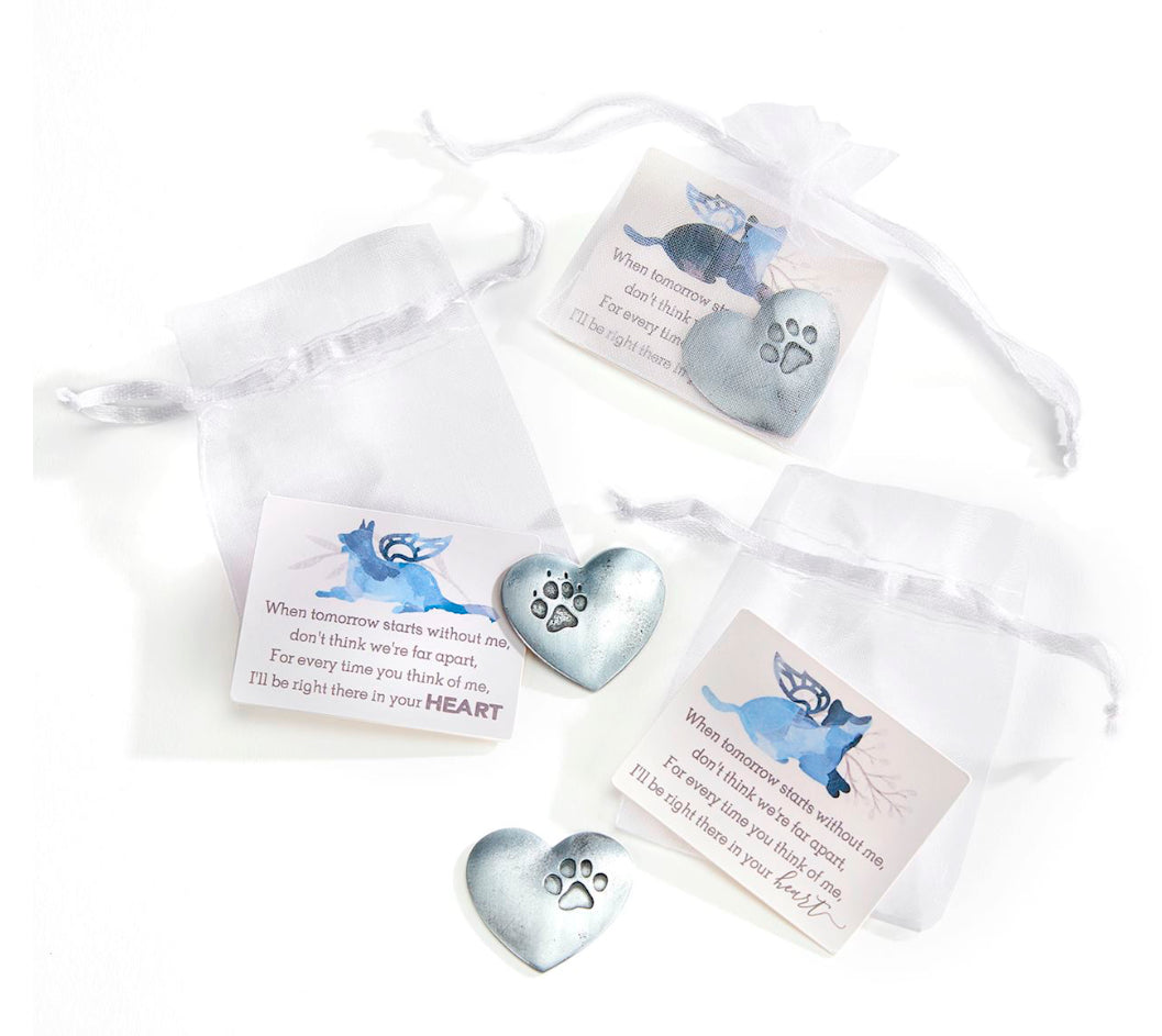 Antique-silver heart shaped token detailed with a paw print, and a sentiment card. Token complete with a white bag with a drawstring closure. Sentiment card: WHEN TOMORROW STARTS WITHOUT ME, DON'T THINK WE'RE FAR APART. FOR EVERY TIME YOU THIN OF ME, I'LL BE RIGHT THERE IN YOUR HEART. Available in 2 assorted designs: Dog Paw, Cat Paw. 48 pieces with an acrylic displayer
