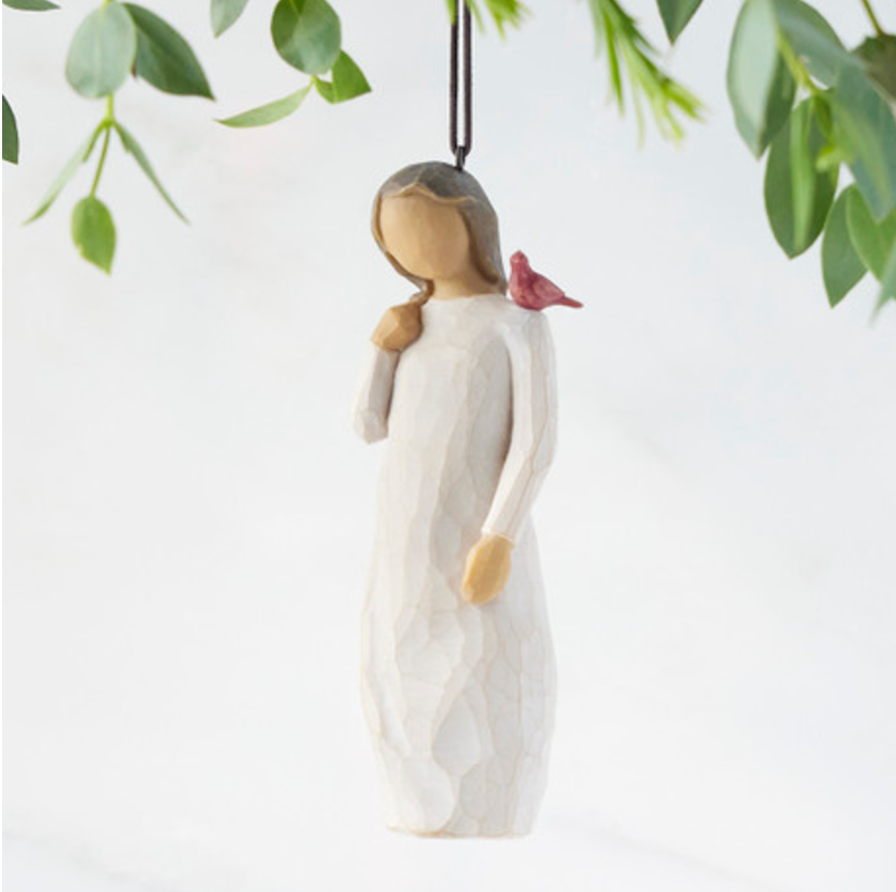 A gift of comfort and healing for one who has lost, or is very far from, a loved one. A reminder that those we love are always with us, in our memories and in our hearts. A red cardinal visits this ornament as a small uplifting symbol of remembrance.Ornament is a smaller-sized version of Messenger figure with brown elastic cord for hanging.