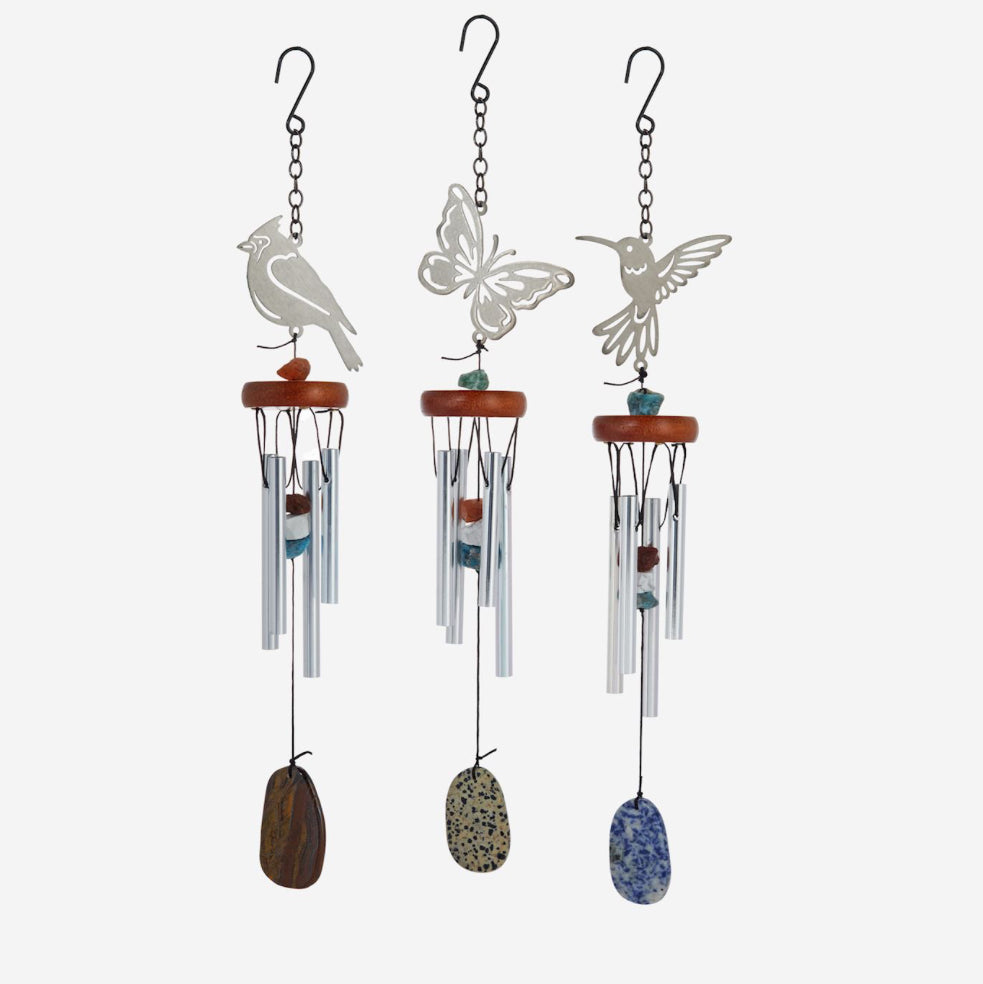 Accent outdoor settings with whimsical musical decor that will fill your space with relaxing chimes in the breeze with this Pendant Charm Mini Windchime. Features a nature-inspired design top, silver metal windchimes, colored beaded detailing, and a pendant charm dangler. Comes with a C-hook hanger. Available in 3 assorted styles: Cardinal, Hummingbird, and Butterfly. MDF, Aluminium, Rock, Iron.