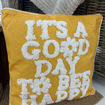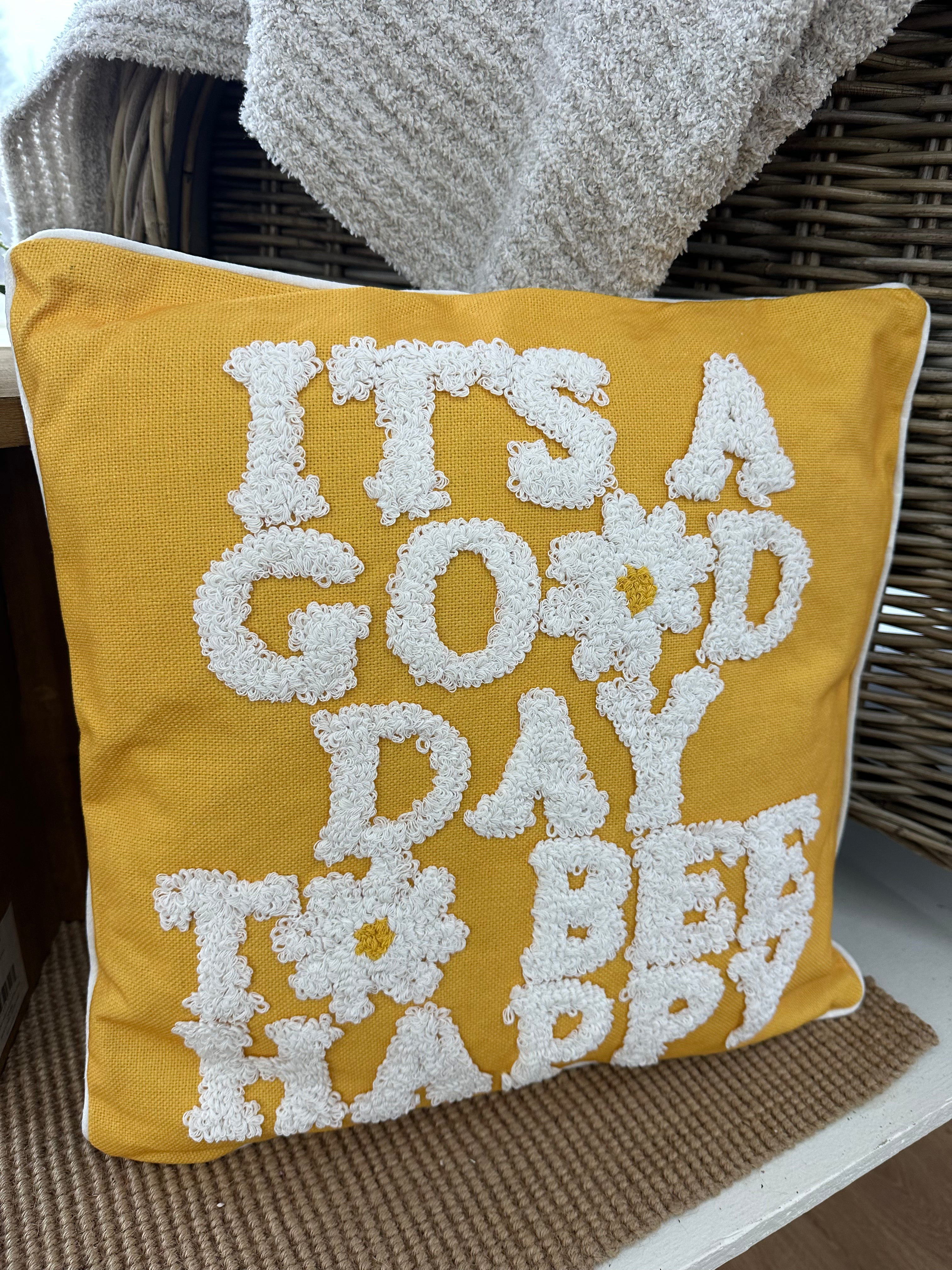 Introducing the It's a Good Day Pillow, a yellow pillow featuring daisies and the phrase "It's a good day to be happy". This cheerful pillow is the perfect addition to any home, providing a reminder to embrace positivity and happiness. Made with high quality materials, it's a great way to brighten up any room and lift your mood. Make every day a good day with this delightful pillow.