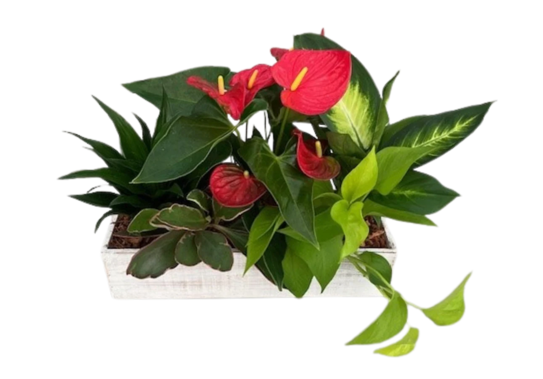 This Fall White Wash Box Planter blends a rustic white-washed wooden box with a vibrant mix of tropical plants, featuring striking red anthuriums that add a pop of color. Perfect for bringing warmth and life to any space, it nurtures a welcoming ambiance while providing easy-care greenery for your home or office. Embrace the charm of fall with this stylish, nature-inspired centerpiece.