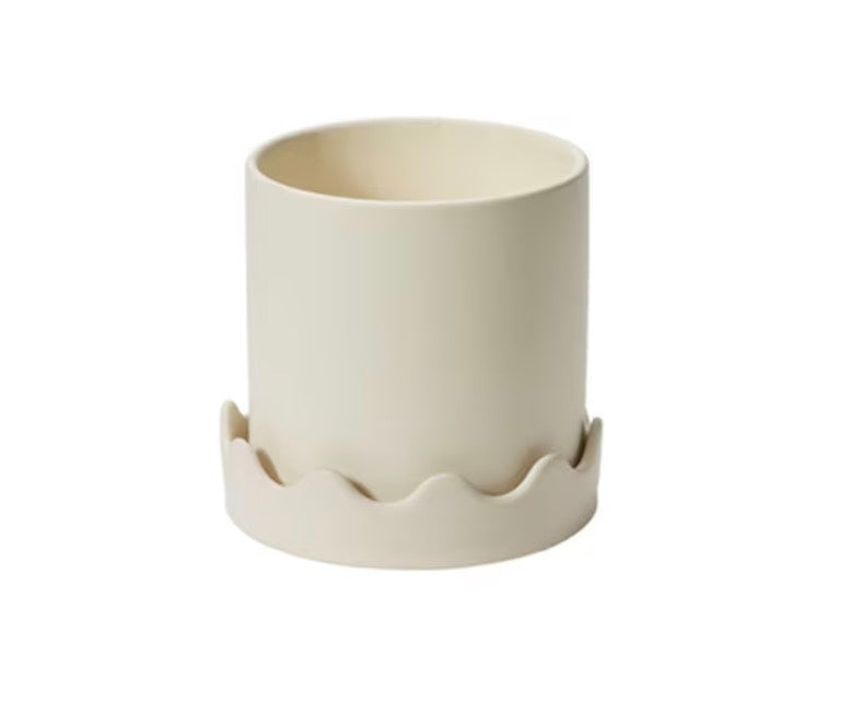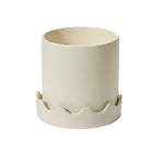 The Pissaro Pot + Saucer is a charming off-white ceramic planter with a scalloped edge, perfect for adding a touch of elegance to your space. Its stylish design not only enhances your plants but also protects surfaces with the included saucer, making it a practical choice for any plant lover.