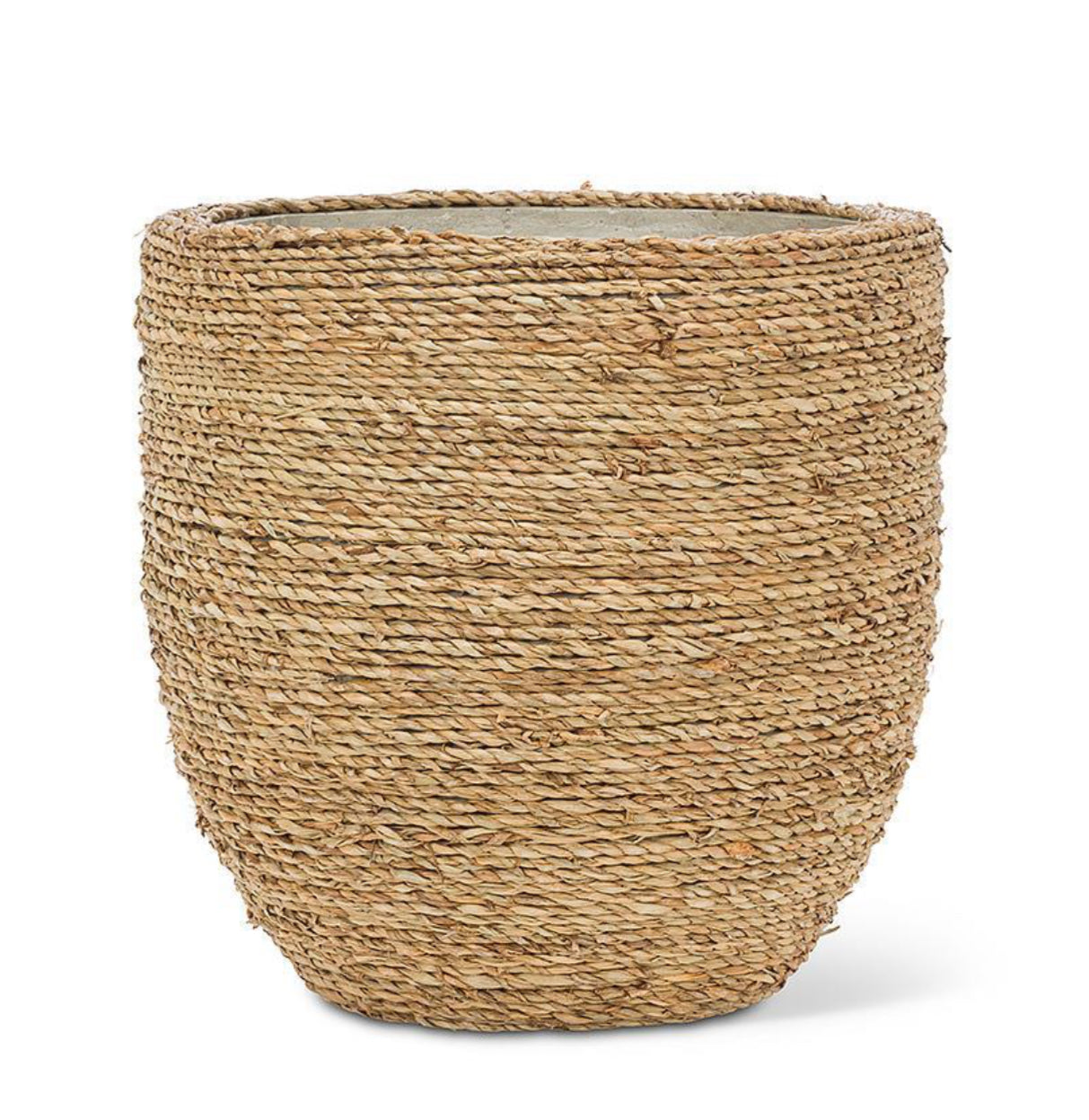 Give your favourite plants a tropical, handcrafted accent with this rustic Large Seagrass Covered Planter. Crafted out of cement and covered in natural woven seagrass, this planter is a picturesque complement to any type of decorative greenery. Other sizes also available.