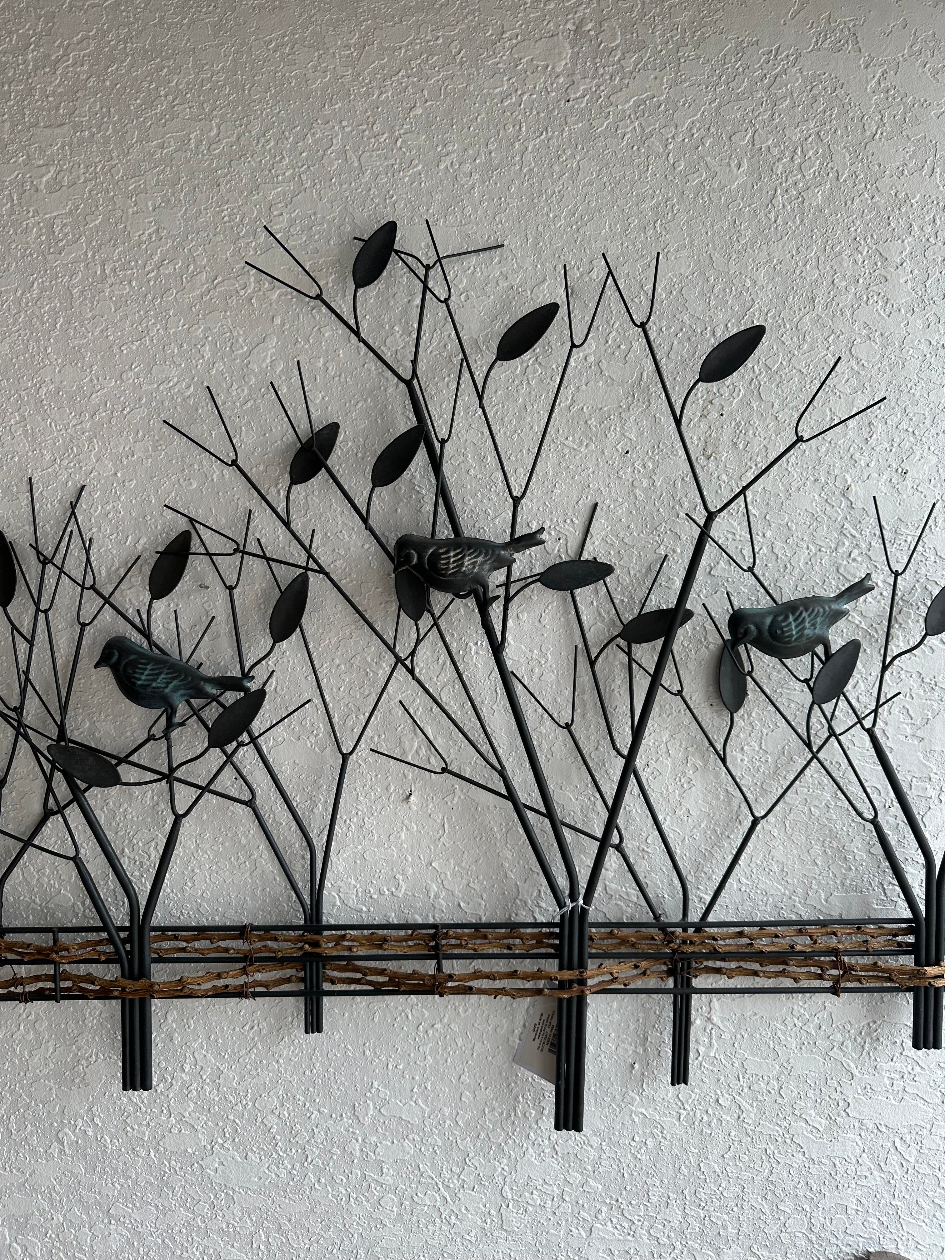 The Metal Bird Art is a stunning piece of decor featuring metal birds perched on metal trees. This unique wall art is crafted from sturdy metal to ensure it will be a long-lasting addition to any room. It's perfect for bringing a bit of nature indoors.
