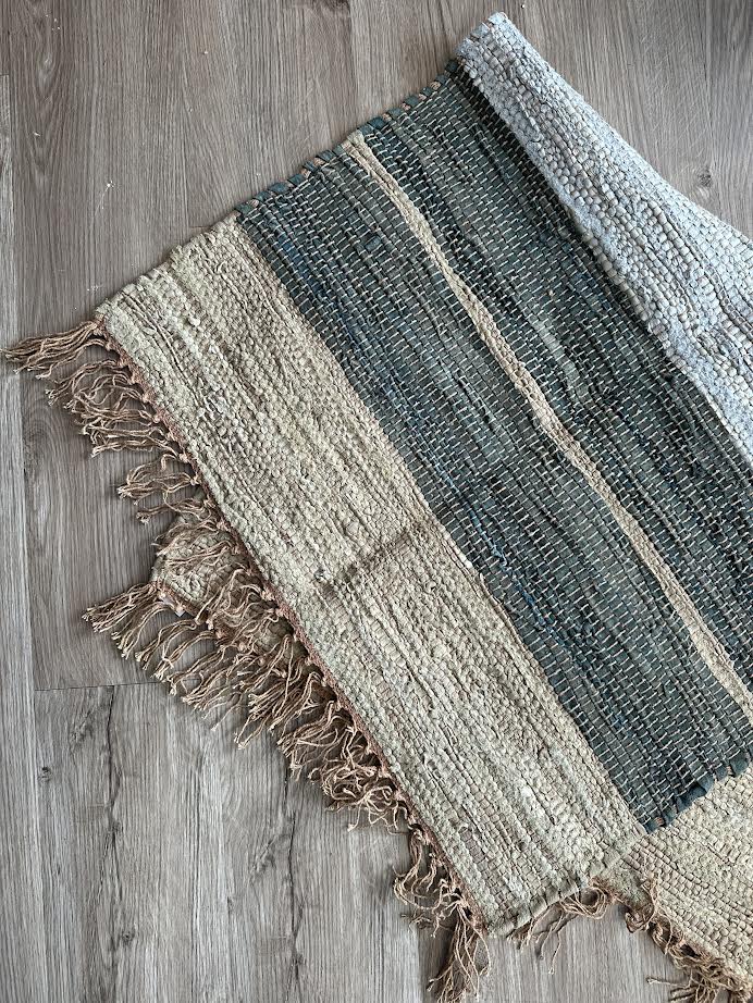 This small, natural woven rug adds a touch of color and texture to any space. Featuring a calming sage green and light blue design, it's a versatile and stylish addition to your home. Perfect for adding comfort and style to your floors without overpowering the room.