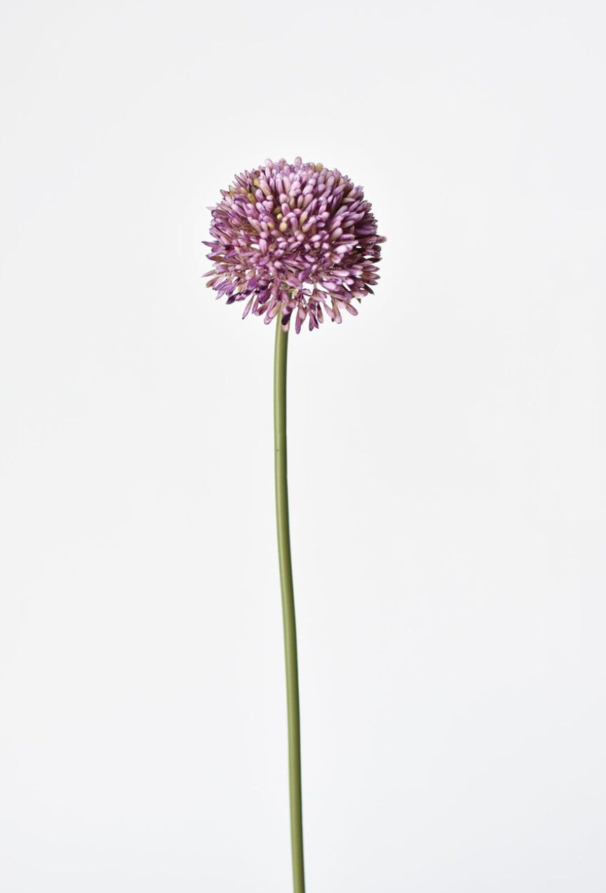 This realistic Allium silk stem boasts a vibrant purple hue and lifelike texture to add a touch of elegance to any floral arrangement. Made from high-quality faux materials, this stem offers long-lasting beauty without the maintenance. Perfect for adding a pop of color to your home decor or special event.
