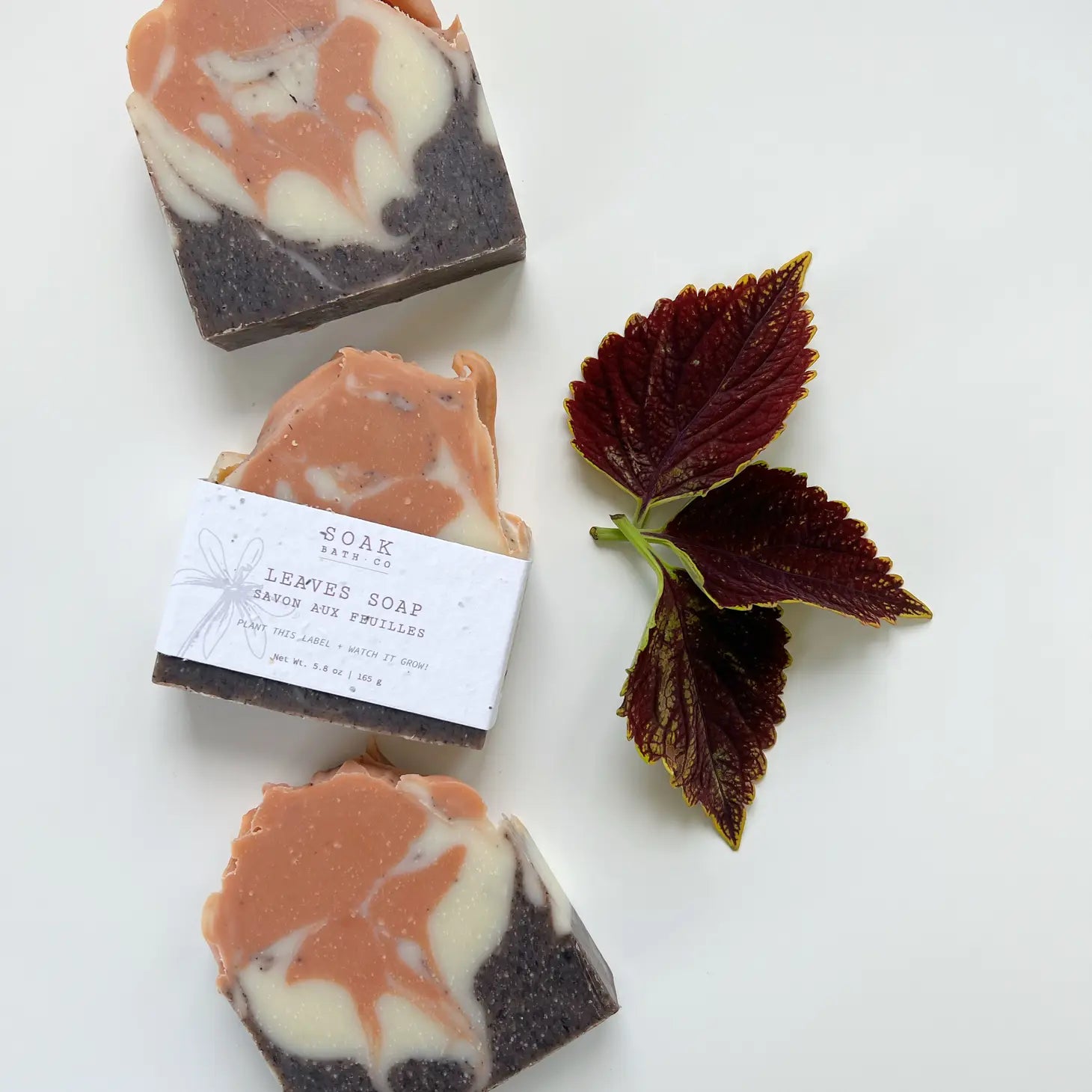 We’re embracing the warm cozy charm of Fall with our Leaves Soap Bar. Inspired by the beautiful colours of the season, the changing of the leaves to yellows, rusts and reds the Leaves Soap Bar is the perfect warm, spicy soap bar for autumn. Leaves is giving us all the cozy up vibes. With mild notes of citrus, florals and spiced fruit this soap bar scent is best described as the smell you’d expect from a Spiced Chai Tea Latte. It’s got us dreaming of cool nights under all the blankets cuddled up with a great book + a cup of tea. The design for this soap bar was inspired by the changing colours of the season, pulling a beautiful muted red tone from our red clay powder and combining it with a deep, rich plum from our all natural alkanet root powder. Leaves Soap Bar makes the perfect gift for friends and family with Fall birthdays or for the person in your life that could use a little extra self care splurge in their life. Including you!