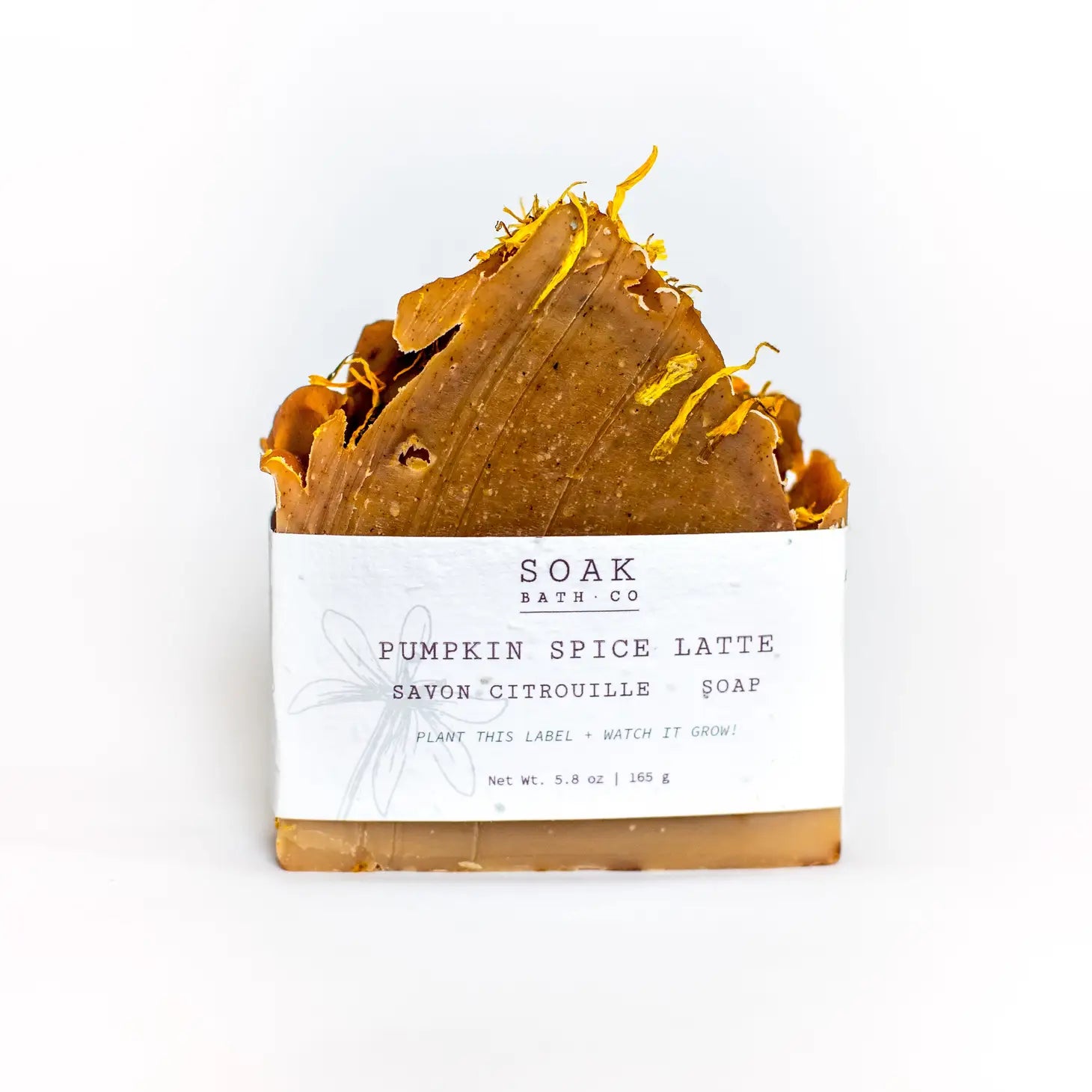 Is it even really fall without Pumpkin Spice? Our Pumpkin Spice Soap Bar captures all the sweet and warm spicy notes of Fall. Scented with rich vanilla and sprinkled with notes of cinnamon, clove and nutmeg our Pumpkin Spice Soap Bar is a must-have for Fall! Sprinkled with calendula petals for a bright, fall-inspired colour contrast. This fall classic has us dreaming of sippin’ on our favourite fall lattes while shopping with our besties! The Pumpkin Spice Soap Bar is the perfect birthday gift idea for friends and family that have fall birthdays! Better yet, spoil your teacher with a fall inspired soap bar for back to school season. This bar is completely zero waste and sustainable. The label on each SOAK Bath Co bar is made of biodegradable, plantable seed paper so you can plant the label and it will grow wildflowers!