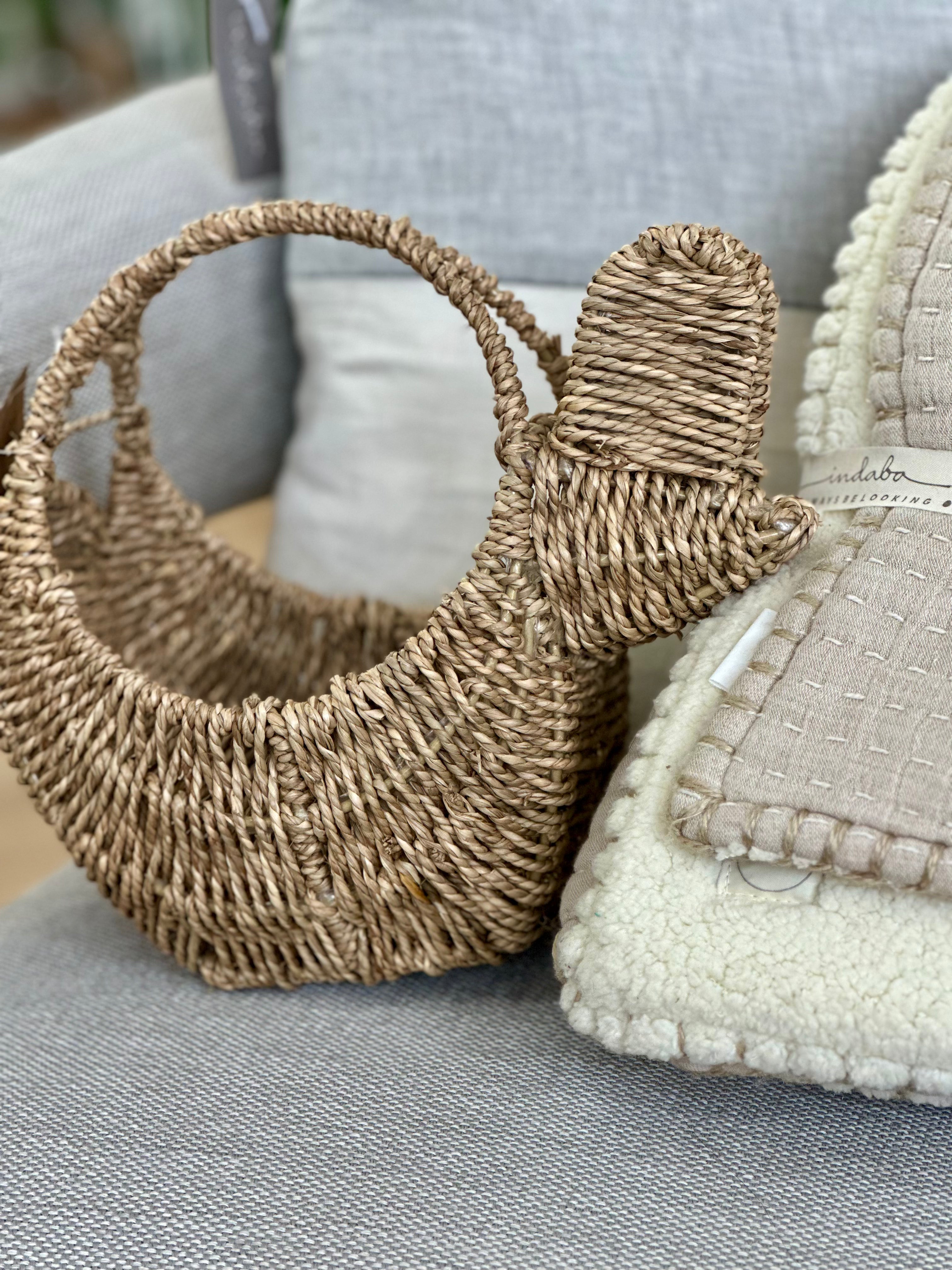 Carry your Easter goodies in style with our Woven Bunny Handled Basket. This charming basket is expertly woven in the shape of a bunny, making it both functional and adorable. The sturdy handles make it easy to transport, while the unique design adds a touch of whimsy to your holiday celebrations.