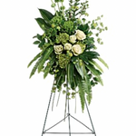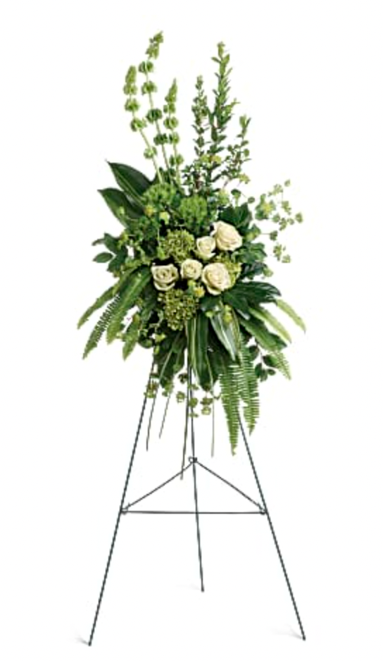 This tranquil spray of miniature green hydrangea, green roses, green trick dianthus, and bells of Ireland is accented with bupleurum, myrtle, sword fern, variegated aspidistra leaves, aralia leaf, bear grass, and lemon leaf.Delivered with a wire easel.