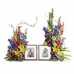 Add inspiring colour to your loving farewell with this beautiful arrangement of roses, lilies and delphinium in all the shades of the rainbow. A breathtaking accent for beloved framed photos.