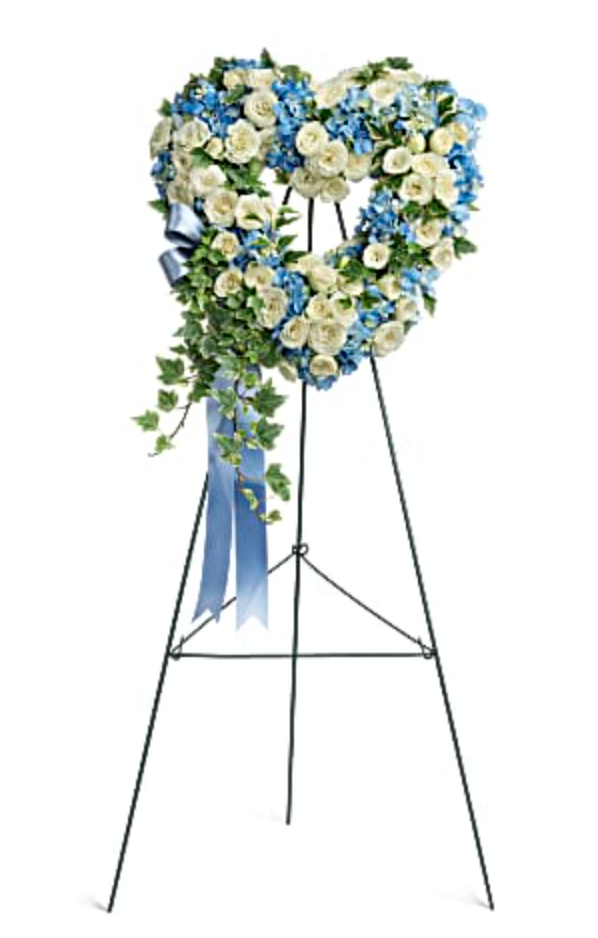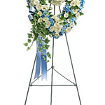 This heartfelt arrangement features blue hydrangea, white spray roses, and trailing greens. Delivered on a wire easel.