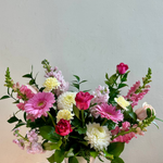 Lush white commercial chrysanthemums, pink roses, light pink snapdragons, butter yellow carnations, pink gerbera daisies, light pink stock, israeli ruscus and lemon leaf. Delivered in an elegant white pot.