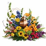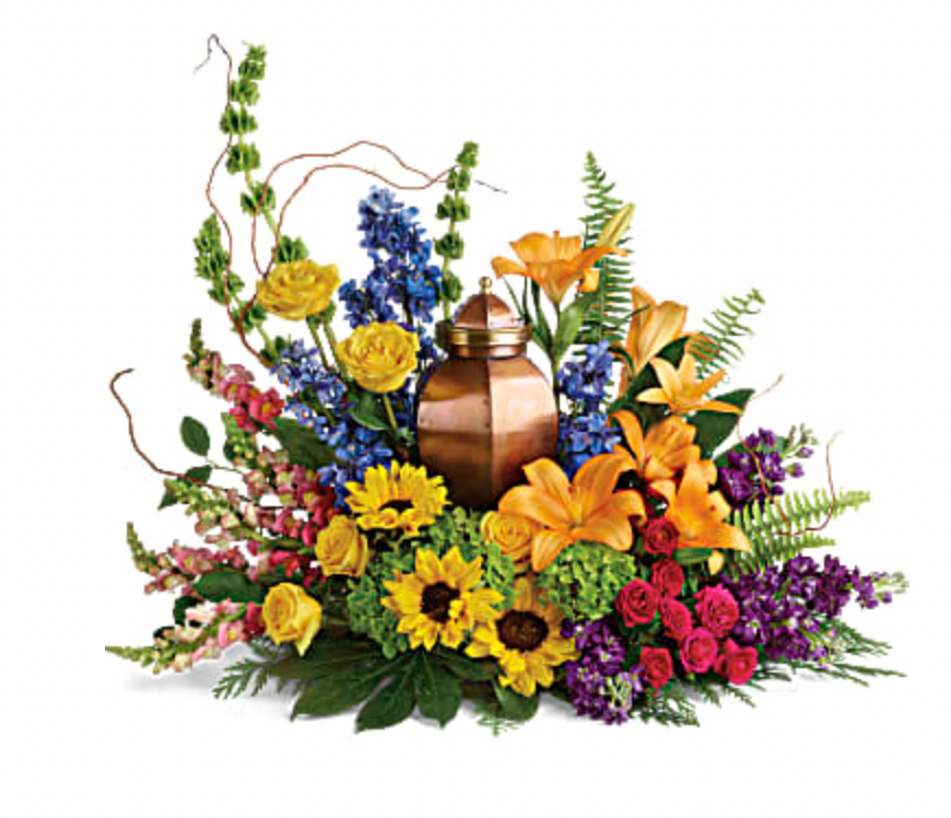 A joyful celebration of a colourful life, this bright bouquet of hydrangea, roses and sunflowers surrounds the cremation urn with natural beauty.