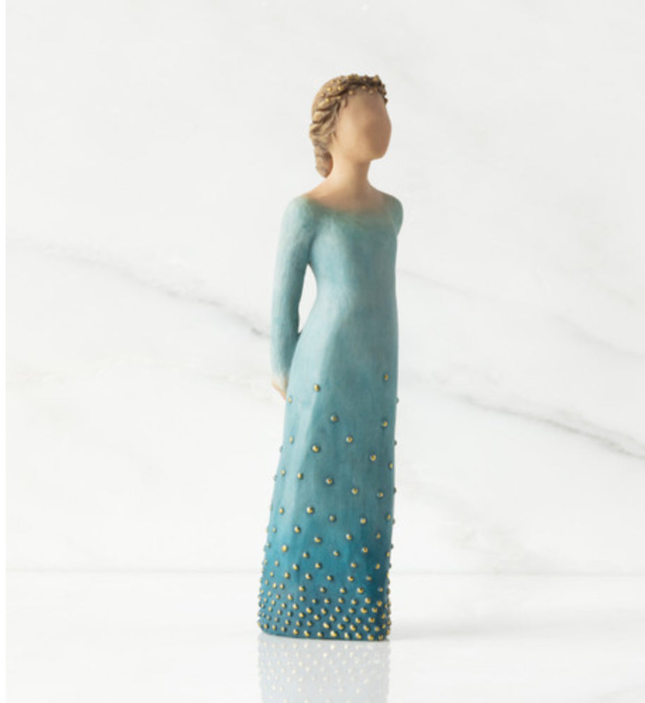 A gift of support and encouragement as a reminder that beauty radiates from within. For one gaining strength and confidence, overcoming adversity or becoming independent. For those who practice self-compassion and prioritize wellness. Radiance is available in two skin tones. This piece has lighter skin and hair; her hair and deep blue ombré dress are dotted with gold leaf