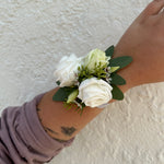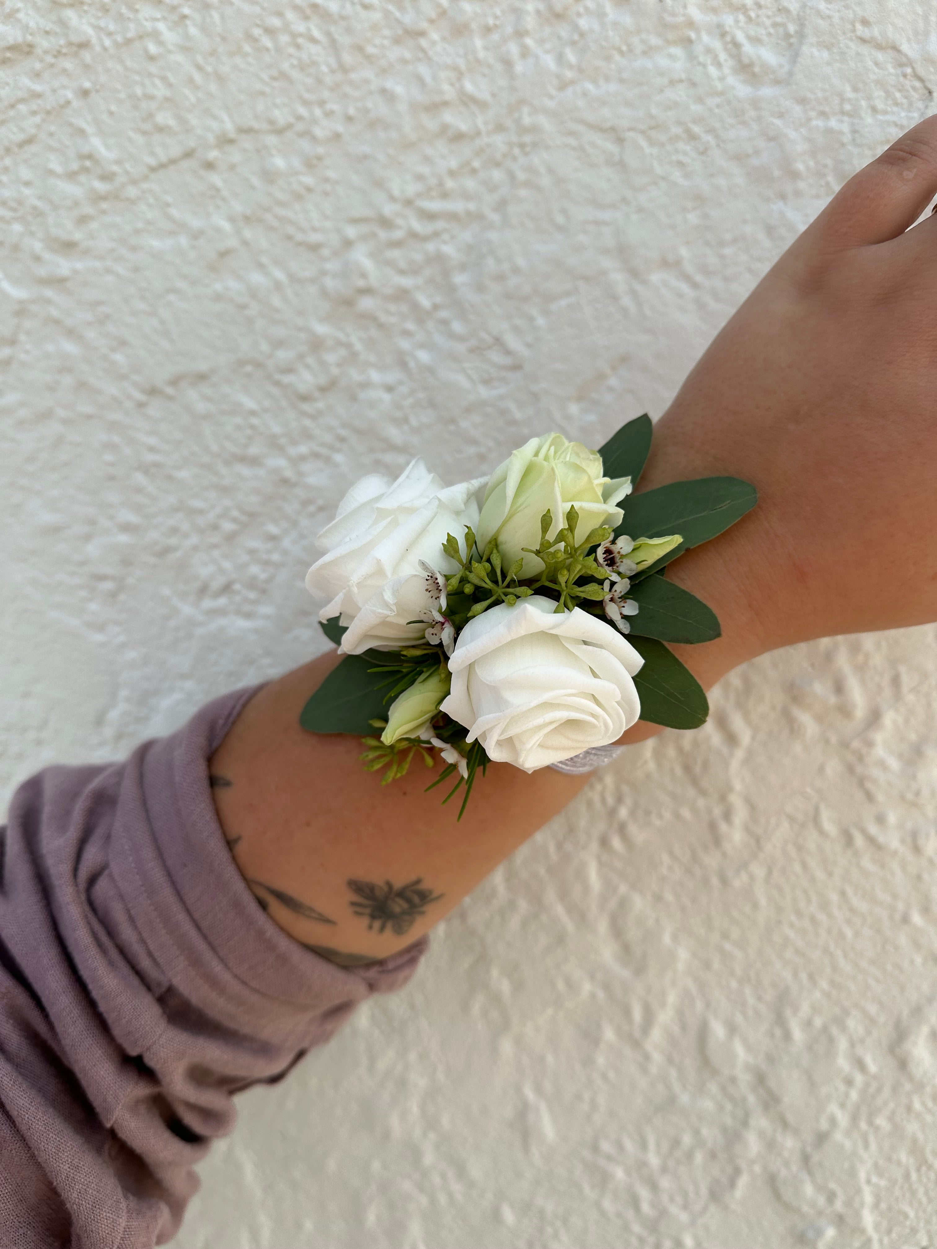 This elegant all-white corsage features delicate white lisianthus, seeded eucalyptus, and white waxflower, beautifully arranged on a silver elastic band for easy and comfortable wear. Perfect for adding a refined touch to any special occasion.