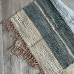 This small, natural woven rug adds a touch of color and texture to any space. Featuring a calming sage green and light blue design, it's a versatile and stylish addition to your home. Perfect for adding comfort and style to your floors without overpowering the room.